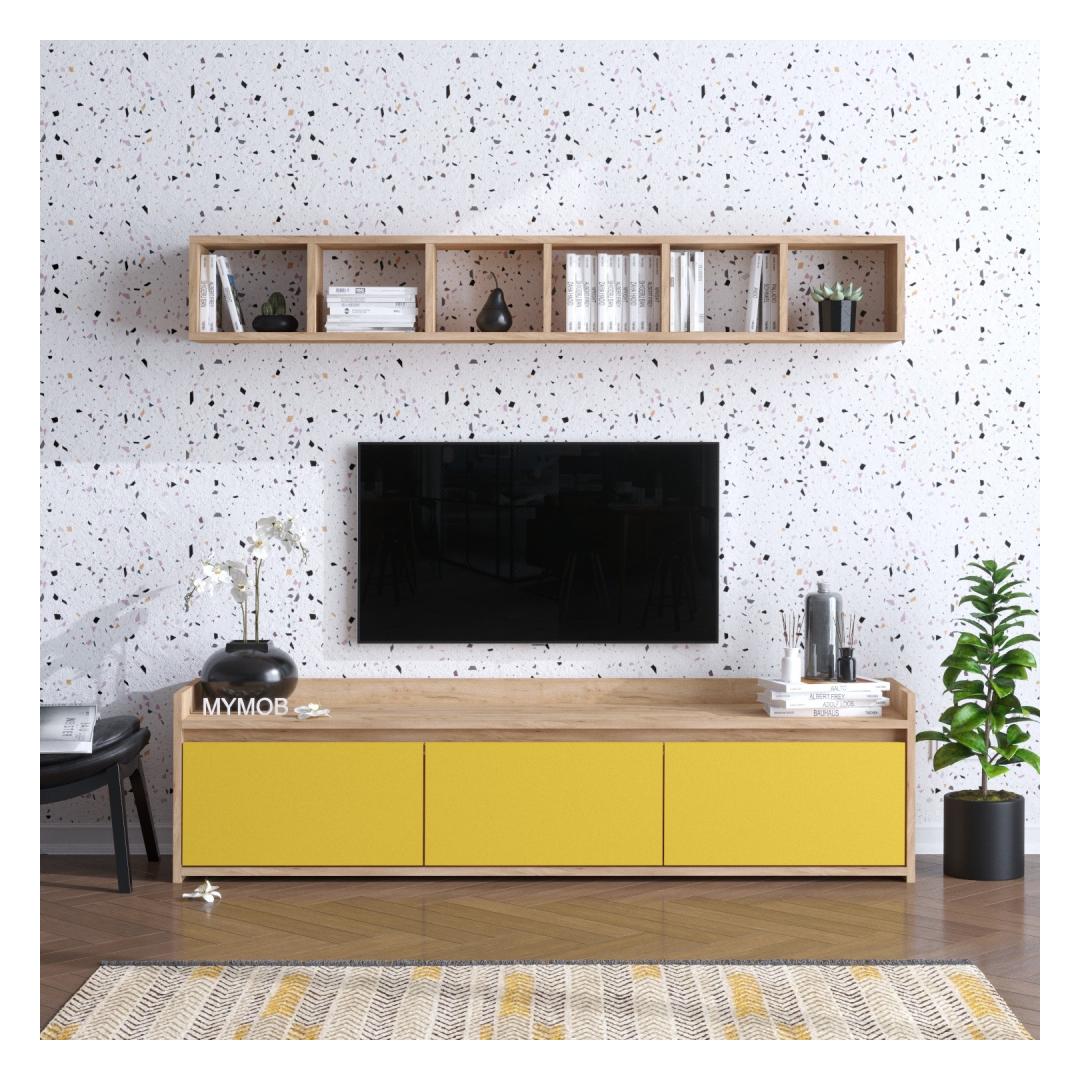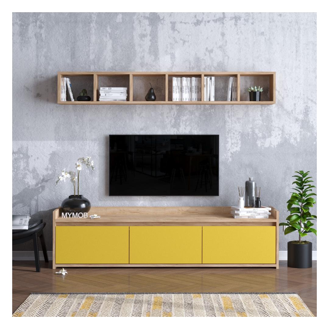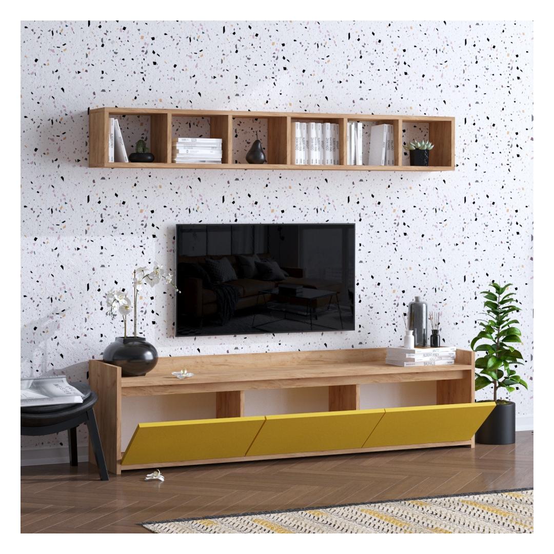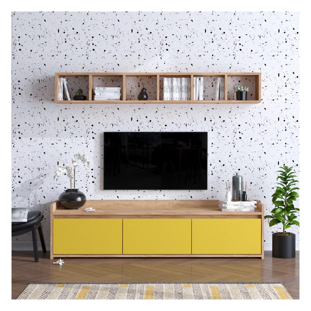 Transformeeri oma elutuba meie moodsa ja uudse teleriga!Uuendage oma eluruumi meie stiilse ja kaasaegse teleriga. Valmistatud 100% melamiiniga kaetud puitlaastplaadist, ei ole see üksus mitte ainult vastupidav, vaid lisab ka elegantsi teie kodu sisustusele. Looge oma unikaalse disainiga statementTamme ja kollase värvi kombinatsiooniga paistab meie telerikomplekt silma. Selle kaasaegne ja uudne kontseptsioon lisab igasse ruumi värske ja trendika meeleolu.Rikkalik panipaik kõigi teie meelelahutusvajaduste jaoksArvukate riiulitega pakub see televiisoripaneel rohkelt hoiuruumi kõigile teie meelelahutuslikele esmatähtsatele asjadele. Alates DVD-dest kuni mängukonsoolideni saate hoida kõike organiseeritult ja käeulatuses. Monitoorne ja praktiline disainSeadme ülemise mooduli laius on 150 cm, kõrgus 45 cm ja sügavus 35 cm, alumise mooduli laius on 150 cm, kõrgus 25 cm ja sügavus 20 cm. Selline mitmekülgne disain võimaldab teil sobitada seda ideaalselt igasse elutoa nurka. Lihtne paigaldamine ja turvaline paigutamineMeie televiisori saab hõlpsasti seinale kinnitada, tagades stabiilsuse ja ohutuse. Saate nautida oma lemmiksaateid ja filme, ilma et peaksite muretsema õnnetuste pärast. Tehnilised üksikasjad:Materjal: Materjal: Materjal: Materjal: Materjal: Materjal: Materjal: Materjal: materjal: 100% melamiiniga kaetud puitlaastplaatPaksus: 18 mmÜlemine mooduli suurus: Laius: 150 cm, kõrgus: 45 cm, sügavus: 35 cm.Alumise mooduli suurus: Laius: 150 cm, kõrgus: 25 cm, sügavus: 20 cm.Värv: Tamm ja kollaneKontseptsioon: Moodne - uudsus Värv: Oak Yellow