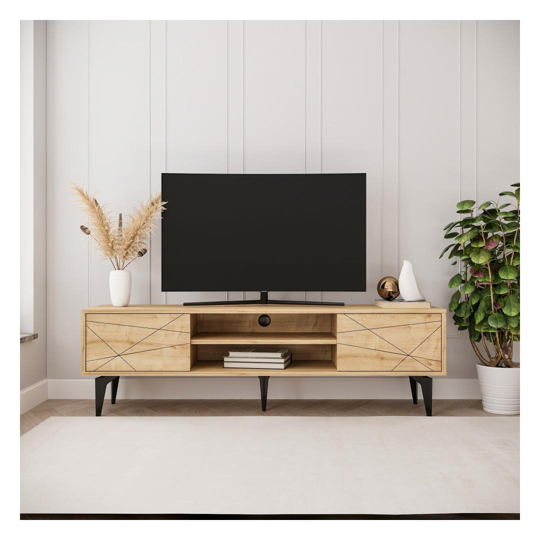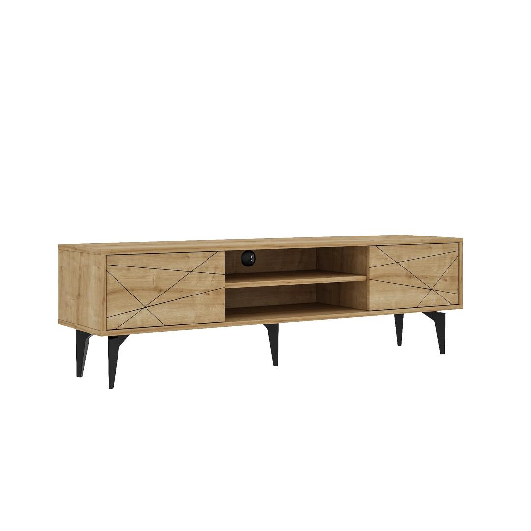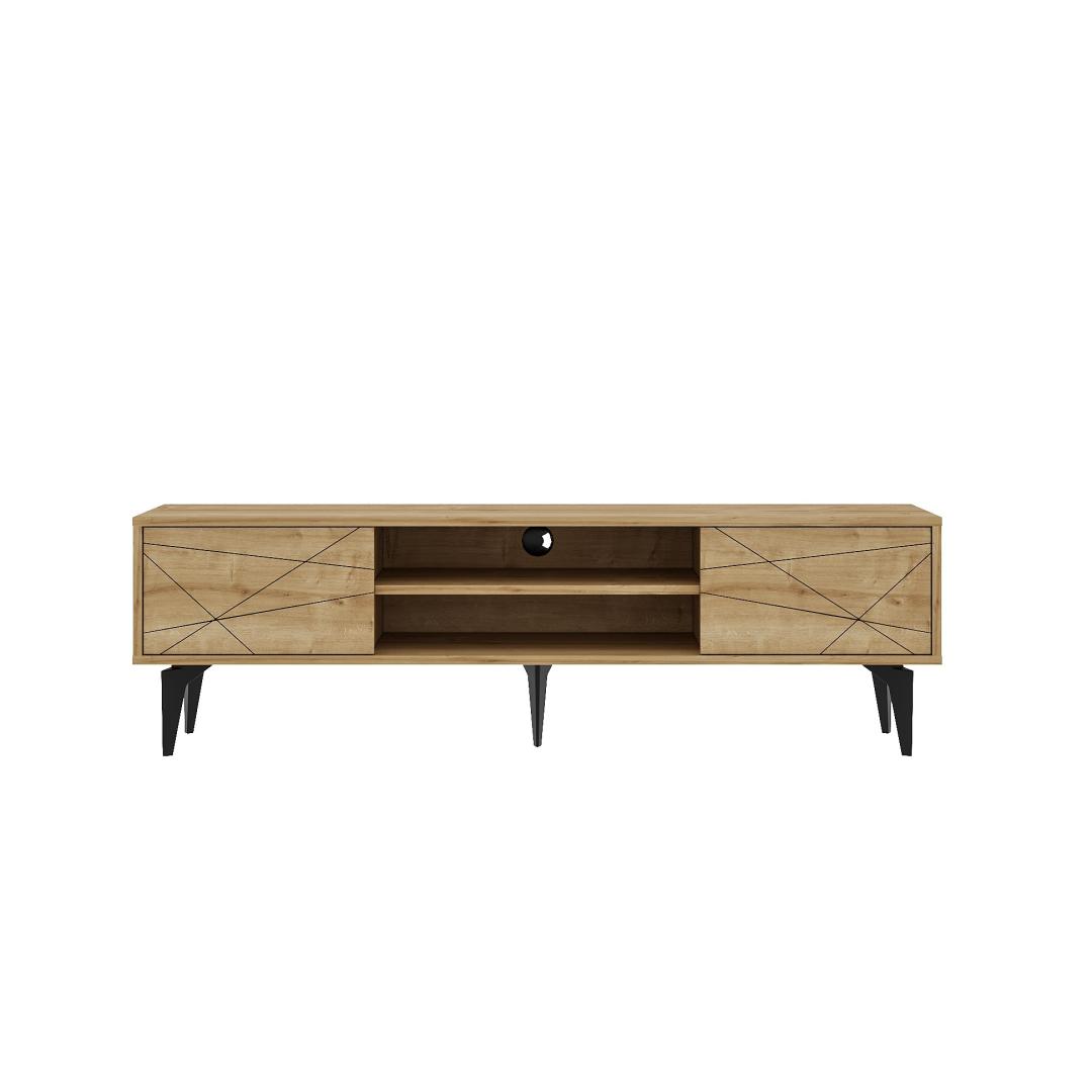 Oletko kyllästynyt kaapelisotkuihin ja likaisiin viihdekeskuksiin? Sano hyvästit kaaokselle tyylikkään ja modernin TV-telineemme avulla. Tämä nykyaikainen huonekalu ei ole vain toimiva, vaan se myös lisää tyylikkyyttä mihin tahansa olohuoneeseen.Muunna asuintilasiParanna kodin viihdekokemustasi TV-telineellämme. Sen selkeät linjat ja nykyaikainen muotoilu kohottavat välittömästi olohuoneesi ilmettä. Suunnittelitpa sitten suosikkiohjelmiesi katsomista tai elokuvaillan järjestämistä, tämä jalusta luo täydellisen ympäristön televisiollesi.Laadukasta käsityötäTämä 100-prosenttisesti melamiinipäällystetystä lastulevystä valmistettu TV-teline on rakennettu kestämään. Tukeva rakenne takaa, että televisiosi on tukevasti tuettu, ja safiirikuparinväri tuo tilaan ripauksen hienostuneisuutta. 18 mm:n paksuinen laatta takaa kestävyyden ja vakauden, joten se on luotettava valinta viihdetarpeisiisi.Pidä järjestyksessäTämän TV-telineen runsaan säilytystilan ansiosta voit pitää medialaitteesi, DVD-levyt ja muut tarvikkeet siististi järjestyksessä. leveys 160 cm tarjoaa runsaasti tilaa televisiollesi, ja 48,2 cm:n korkeus ja 29,6 cm:n syvyys tarjoavat lisää säilytysmahdollisuuksia. jalkojen korkeus 19cm lisää tyylikkyyttä kokonaisuuteen.Tekniset tiedot:Materiaali:100% melamiinipinnoitettu lastulevyPaksuus:18mmLeveys:160cmKorkeus:48.2cmSyvyys:29.6cmJalkojen korkeus:19cmVäri:Sapphire Grey (safiirinharmaa) Väri: Sapphire Oak