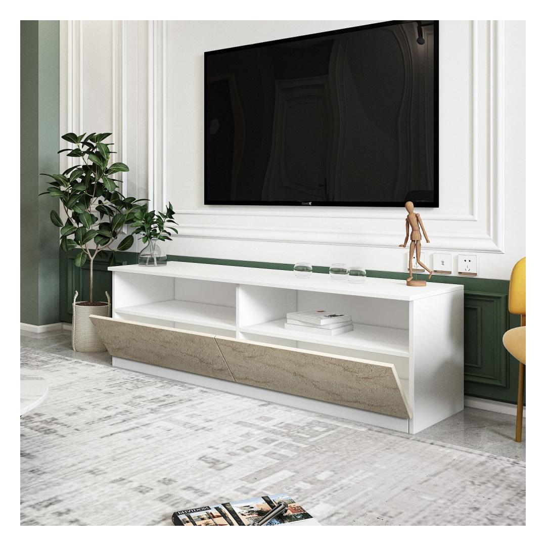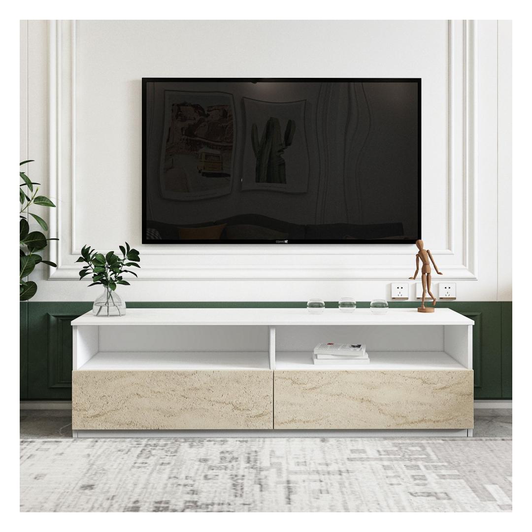 Muunna olohuoneesi tyylikkääksi ja nykyaikaiseksi tilaksi upealla TV-telineellämme. Tämä virtaviivainen ja tyylikäs kappale on suunniteltu tehostamaan kotisi sisustusta ja tarjoamaan toimivan ratkaisun viihdetarvikkeiden järjestämiseen: Valkoisen ja travertiinivärin yhdistelmä antaa tälle TV-telineelle modernin ja hienostuneen ilmeen, joka sopii mihin tahansa sisustukseen. kestävyys: 100-prosenttisesti melamiinipinnoitetusta lastulevystä valmistettu TV-teline on suunniteltu kestämään ja kestämään päivittäistä kulutusta. runsaasti säilytystilaa: 144 cm leveä ja 49,8 cm korkea TV-teline tarjoaa runsaasti säilytystilaa medialaitteillesi, DVD-levyillesi ja muille esineille.Helppo koota:Tämä TV-teline on helppo koota, sillä siinä on selkeät ohjeet ja kaikki tarvittavat kiinnikkeet.päivitä olohuoneesi tyylikkäällä ja toimivalla TV-telineellä jo tänään!Tekniset tiedot:Materiaali:100 % melamiinipinnoitettua lastulevyäPaksuus:18 mmLeveys:144 cmLeveys:49,8 cmKorkeus:45 cmVäri:Valkoinen ja travertiini:Valkoinen ja travertiini Väri: Valkoinen travertiini