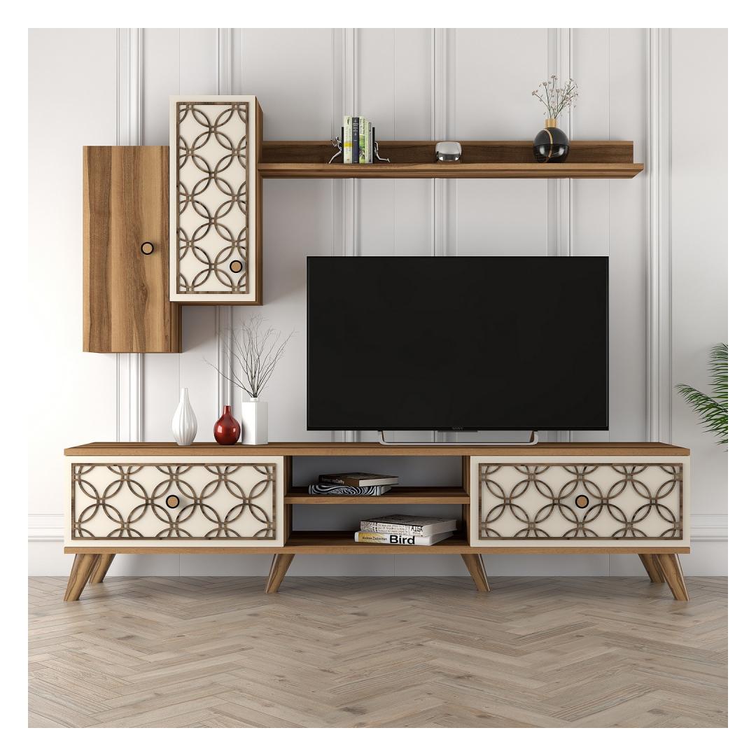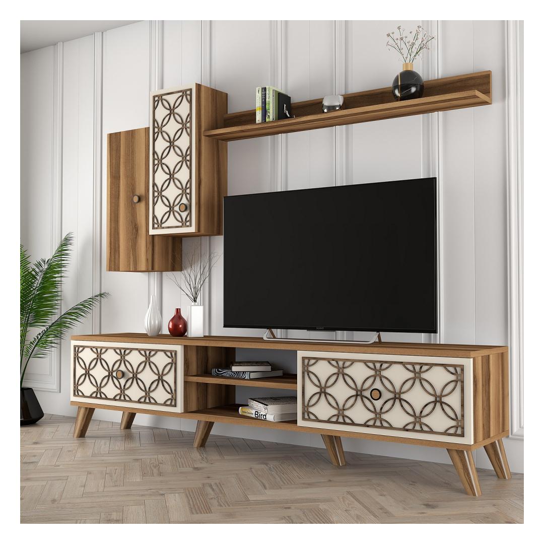 Muuda oma elutuba stiilseks ja rafineerituks ruumiks meie suurepärase telerikapi abil. Valmistatud 100% melamiinkattega puitlaastplaadist, kiirgab see kapp elegantsi ja vastupidavust nagu mitte ükski teine. 18 mm paksus ja 4 mm CNC-reljeef lisavad luksuse puudutuse, samas kui plastjalad tagavad stabiilsuse ja toe.Tõsta oma eluruumi180 cm laiuse ja 44 cm kõrgusega telerikapp on ideaalne täiendus igasse kaasaegsesse koju. Kaasaegne seina riiul ja kapid pakuvad piisavalt hoiuruumi kõigi sinu meelelahutuse tarvikute jaoks, hoides sinu elutoa korras ja organiseerituna. Pähklipuu ja kreemika värvikombinatsioon lisab sinu ruumile soojust ja rafineeritust, luues hubase ja kutsuva atmosfääri.Kaasaegne disain, ajatu elegantsSelle telerikapi kaasaegne ja uuenduslik disain on ideaalne neile, kes hindavad kaasaegset esteetikat koos traditsioonilise võluga. Peened damask- ja lillemustrid lisavad sinu elutuppa ainulaadset ja stiilset ilmet, muutes selle sinu ruumi keskpunktiks.Tehnilised andmed:Materjal: 100% melamiinkattega puitlaastplaatPaksus: 18 mmCNC-reljeef: 4 mmJalad: PlastikTelerikapi suurus: L180cm x K44cm x S35cmSeina riiuli suurus: L120cm x K14.2cm x S13.6cmKapi suurus: L26.5cm x K63cm x S21.8cm (2 tk)Värv: Pähklipuu ja kreemKontseptsioon: Kaasaegne - Uuenduslik, Ameerika traditsiooniline, Damask, LilleUuenda oma elutuba meie hämmastava telerikapiga ja koge stiili ja funktsionaalsuse täiuslikku segu. Ära jäta kasutamata võimalust tõsta oma ruumi ja luua tõeliselt luksuslik atmosfäär. Tellige nüüd ja muuda oma kodu juba täna! Värv: Walnut Cream