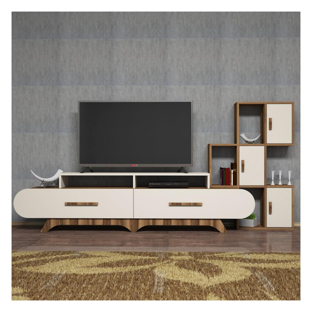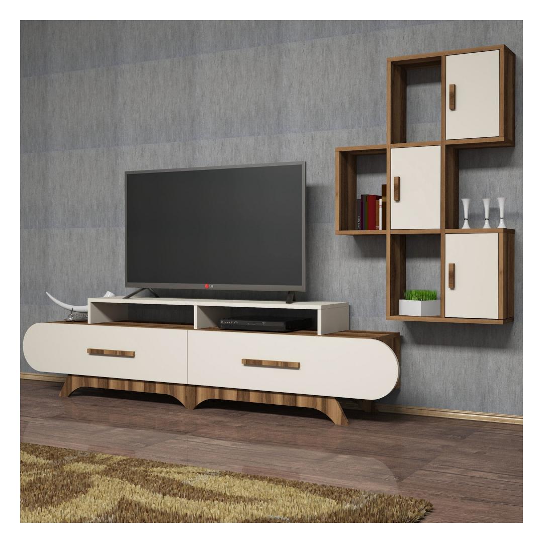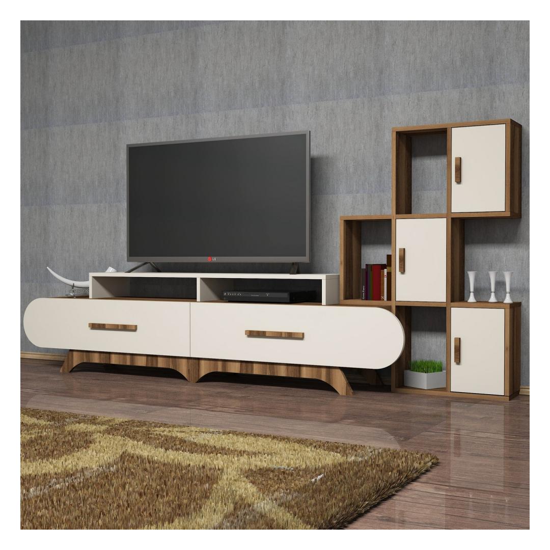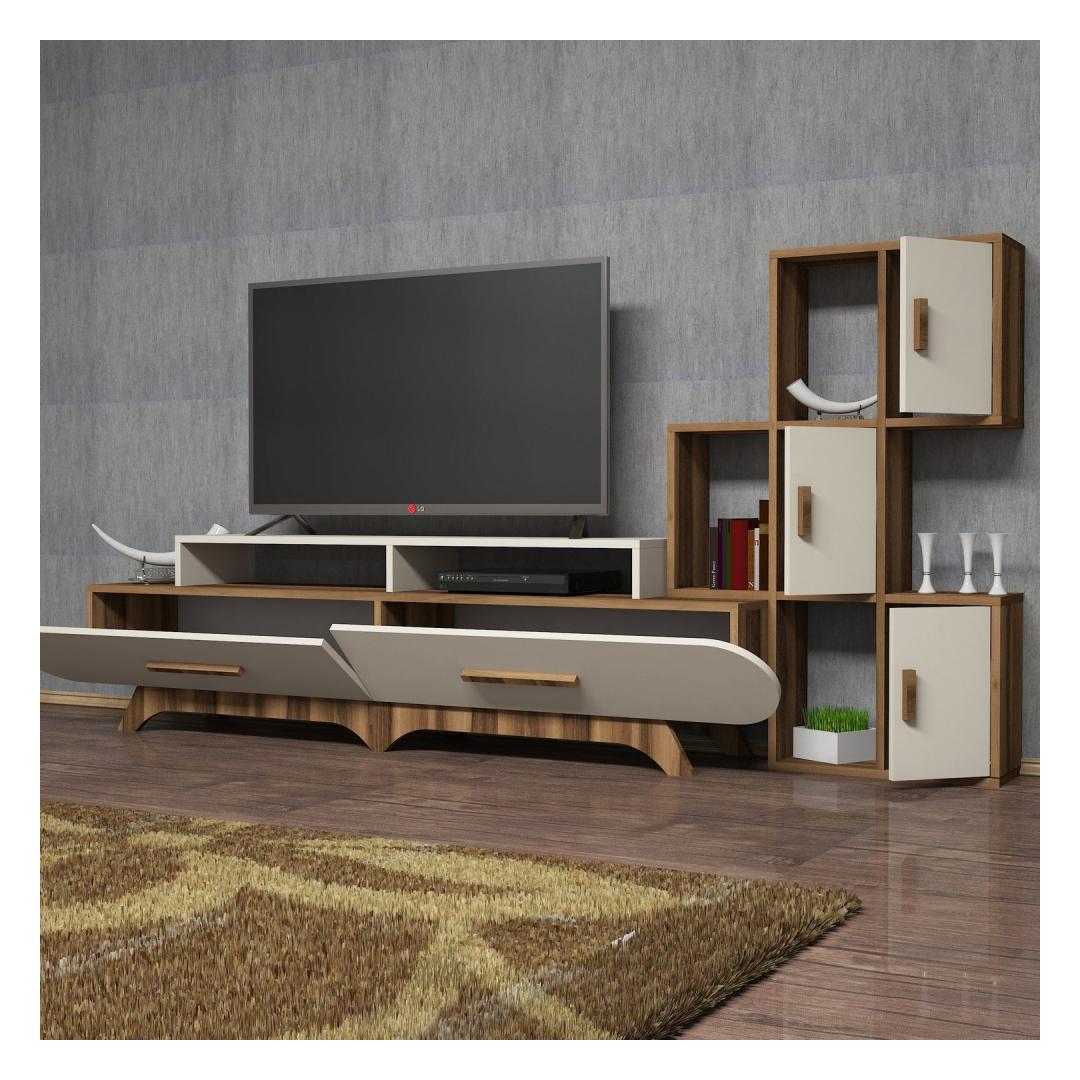 Tutvustame meie uimastavat televiisorikappi, mis on täiuslik segu moodsast disainist ja funktsionaalsusest, mis muudab teie eluruumi stiilseks ja elegantseks paradiisiks. Tõstke oma eluruum ülesMeie teler on oma elegantse ja kaasaegse disainiga keerukuse kehastus. Selle puhtad jooned ja minimalistlik esteetika tõstavad koheselt mis tahes ruumi välimust, lisades teie eluruumile luksust.Võrratu kvaliteetSee 100% melamiiniga kaetud puitlaastplaadist valmistatud teler on valmistatud kestma. 18 mm paksus tagab vastupidavuse ja tugevuse, mis teeb sellest usaldusväärse investeeringu aastateks. Rikkalik hoiuruumTänu arvukatele riiulitele pakub see telerikapp rohkelt hoiuruumi kõigile teie meediatarvikutele. Alates dvd-dest ja mängukonsoolidest kuni raamatute ja dekoratiivsete esemeteni on kõigel oma kindel koht, hoides teie elutoa segadusteta ja korrastatuna. Versatiivne disainSee teler ei ole mitte ainult stiilne lisa teie kodule, vaid ka uskumatult mitmekülgne. Seda saab kinnitada seinale, mis võimaldab teil kohandada selle paigutust vastavalt oma eelistustele ja ruumi paigutusele. Esteetiline atraktiivsusPähklipuu- ja kreemikat värvi kombinatsioon annab sellele telerile ajatu atraktiivsuse. Pähklipuu soojad toonid täiendavad suurepäraselt kreemjaid toone, luues teie eluruumis harmoonilise ja kutsuva atmosfääri. Tehnilised üksikasjad:Materjal: Materjal: Materjal: Materjal: Materjal: Materjal: Materjal: Materjal: materjal: 100% melamiiniga kaetud puitlaastplaatPaksus: 18 mmTelerikapi mõõtmed: Laius: 205 cm, kõrgus: 50 cm, sügavus: 36. 8 cm. Laius: 130 cm, kõrgus: 11 cm, sügavus: 30 cm.Seina riiuli mõõtmed: Laius: 75 cm, kõrgus: 112. 6 cm, sügavus: 20 cmVärv: Pähklipuu ja kreemikasKontseptsioon: Kaasaegne - uudsus Värv: Walnut Cream