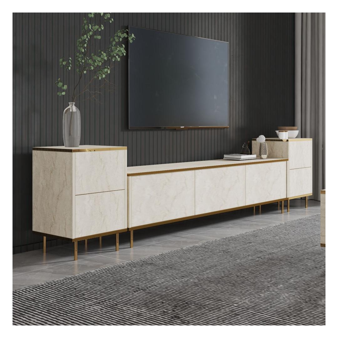 Muunna olohuoneesi ylelliseksi ja tyylikkääksi tilaksi upealla tv-yksiköllämme, jossa on travertiiniä ja kultaa. Tämä TV-yksikkö ei ole pelkkä huonekalu, vaan tyylin ja hienostuneisuuden ilmentymä. Marmorinen konsepti tuo kotiisi ripauksen ylellisyyttä ja tekee siitä minkä tahansa huoneen keskipisteen.Nosta olohuoneesi tasolleTämän TV-yksikön virtaviivainen muotoilu tuo olohuoneeseesi ripauksen nykyaikaisuutta, kun taas marmorinen viimeistely tuo klassista eleganssia. Travertiinin ja kullan värien yhdistelmä luo ylellisen estetiikan, joka tekee vaikutuksen vieraisiin ja kohottaa kotisi yleisilmettä.Toiminnallinen ja tyylikäsTämä TV-yksikkö ei ainoastaan näytä kauniilta, vaan tarjoaa myös runsaasti säilytystilaa kaikille viihdetarvikkeillesi. TV-teline tarjoaa tukevan alustan televisiollesi, kun taas kaapit tarjoavat säilytystilaa DVD-levyille, kaukosäätimille ja muille tavaroille. Pysy järjestyksessä tyylistä tinkimättä.Laadukas käsityöTämä 100-prosenttisesti melamiinipinnoitetusta lastulevystä valmistettu TV-yksikkö on rakennettu kestämään. sen 18 mm:n paksuus takaa kestävyyden ja vakauden, joten voit nauttia tästä tuotteesta vuosia. Laadukkaat materiaalit ja yksityiskohtiin kiinnitetty huomio tekevät tästä TV-yksiköstä arvokkaan investoinnin kotiisi.Tekniset tiedot:Materiaali:100 % melamiinipinnoitettu lastulevyPaksuus: 18 mmTelevisiotelineen mitat: Marmori Väri: Travertiinikulta