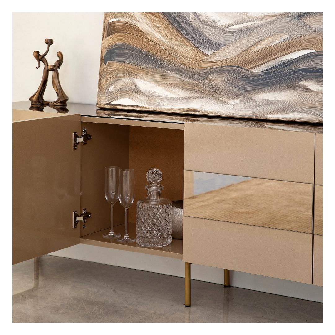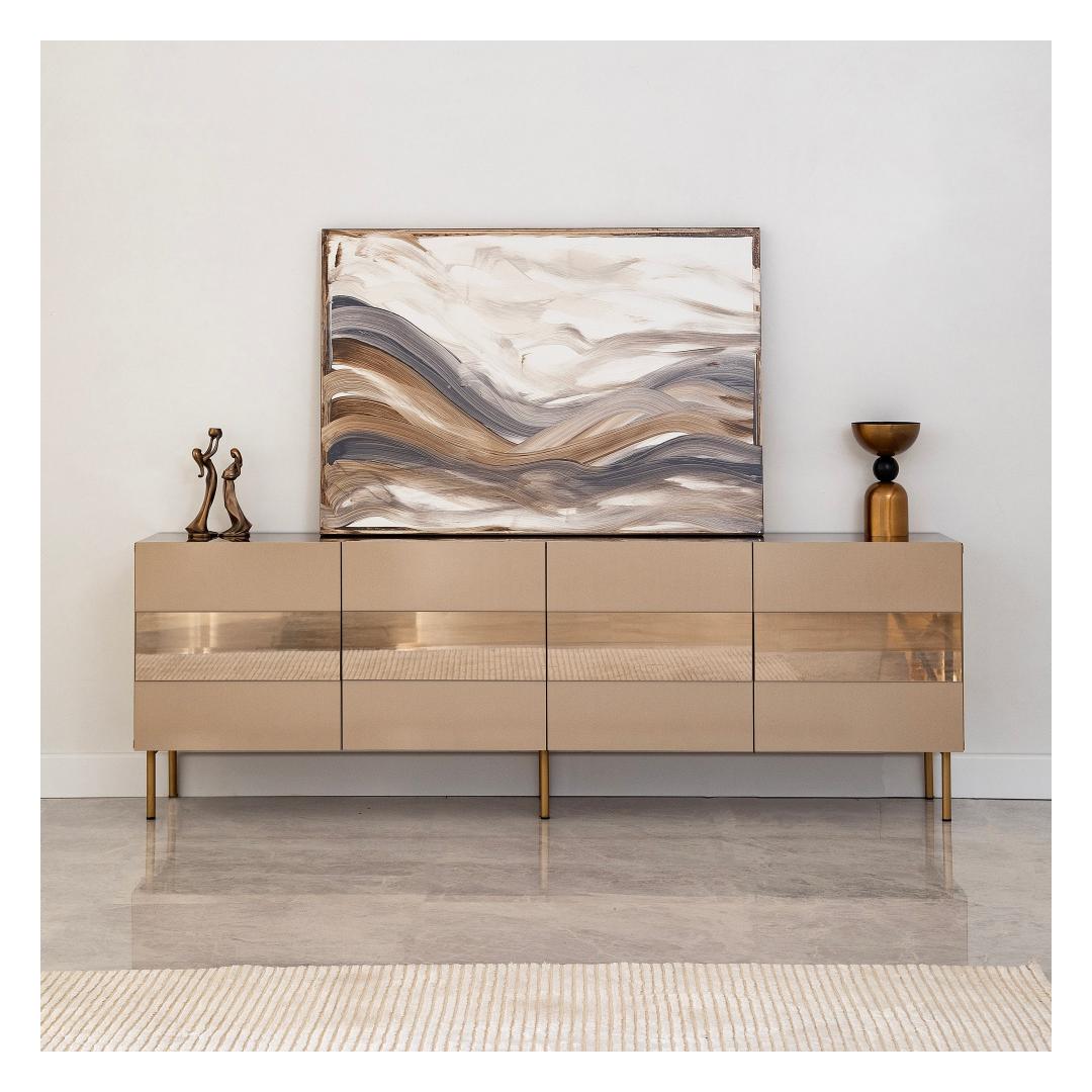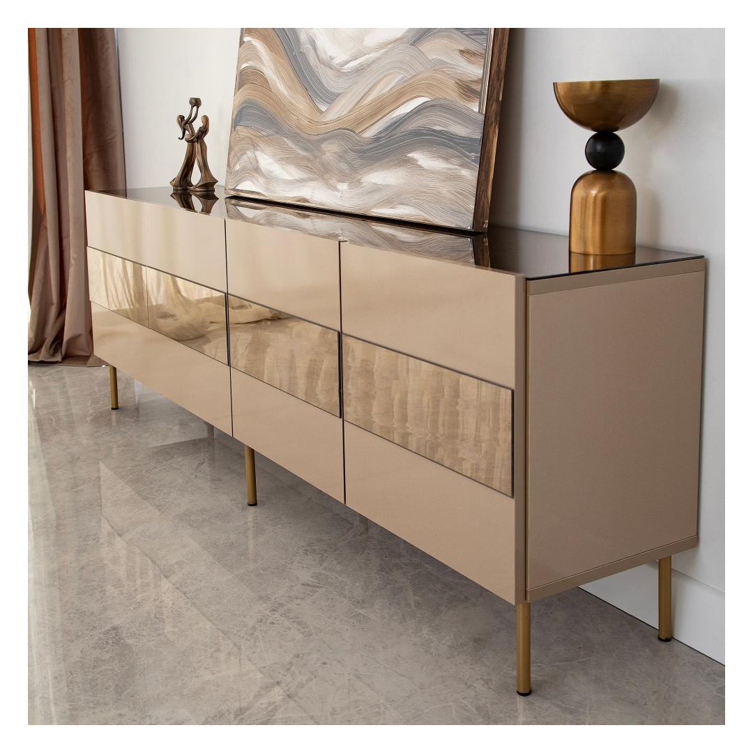 Korosta olohuoneesi upealla TV-konsolilla Esittelyssä upea TV-konsoli, joka muuttaa olohuoneesi ylelliseksi paratiisiksi. Tämä äärimmäisen tarkasti ja yksityiskohtiin paneutuen valmistettu TV-konsoli on täydellinen yhdistelmä eleganssia ja toiminnallisuutta. Vapauta tunteiden voima Kuvittele, että tulet kotiin pitkän päivän jälkeen, vajoat mukavaan sohvaasi ja käynnistät suosikkiohjelmasi. Televisiomme vie kokemuksen aivan uudelle tasolle. Sen tyylikäs muotoilu ja valloittavat värit vangitsevat aistisi välittömästi ja luovat hienostuneen ja lämpimän ilmapiirin.Käsityön mestariteosTämä 100-prosenttisesta mdf-muovista valmistettu TV-konsoli on tehty kestämään. Sen tukeva rakenne takaa kestävyyden ja vakauden, minkä ansiosta voit sijoittaa arvokkaan televisiosi turvallisesti paikalleen. 18 mm:n paksuus lisää lisävahvuutta, mikä takaa, että TV-telineesi kestää aikaa. Suunniteltu mukavuutta vartenYmmärrämme järjestelyn merkityksen asuintilassasi. Siksi TV-telineessämme on runsaasti säilytystilaa, jotta mediat, DVD-levyt ja muut olennaiset tavarat pysyvät siististi järjestyksessä. Tilavat hyllyt tarjoavat helpon pääsyn suosikkielokuvillesi ja -peleillesi, mikä tekee viihteestä helppoa. Tekniset tiedot:Materiaali:Materiaali:Materiaali:Materiaali:Materiaali:Materiaali:Materiaali:Materiaali:Materiaali:Materiaali:Materiaali:Materiaali:Materiaali:Materiaali:Materiaali:Materiaali:100 % MDFPaksuus:18 mmLeveys:180 cmKorkeus:59 cmSyvyys:35 cmJalkojen korkeus:15 cmVäri:pronssi ja kultaVäritä olohuoneesi TV-telineellämme ja koe tyylin ja toiminnallisuuden täydellinen yhdistelmä. Tilaa nyt ja anna TV-konsolimme tyylikkyyden muuttaa tilasi rentoutumisen ja viihteen paratiisiksi. Väri: Pronssi Kulta