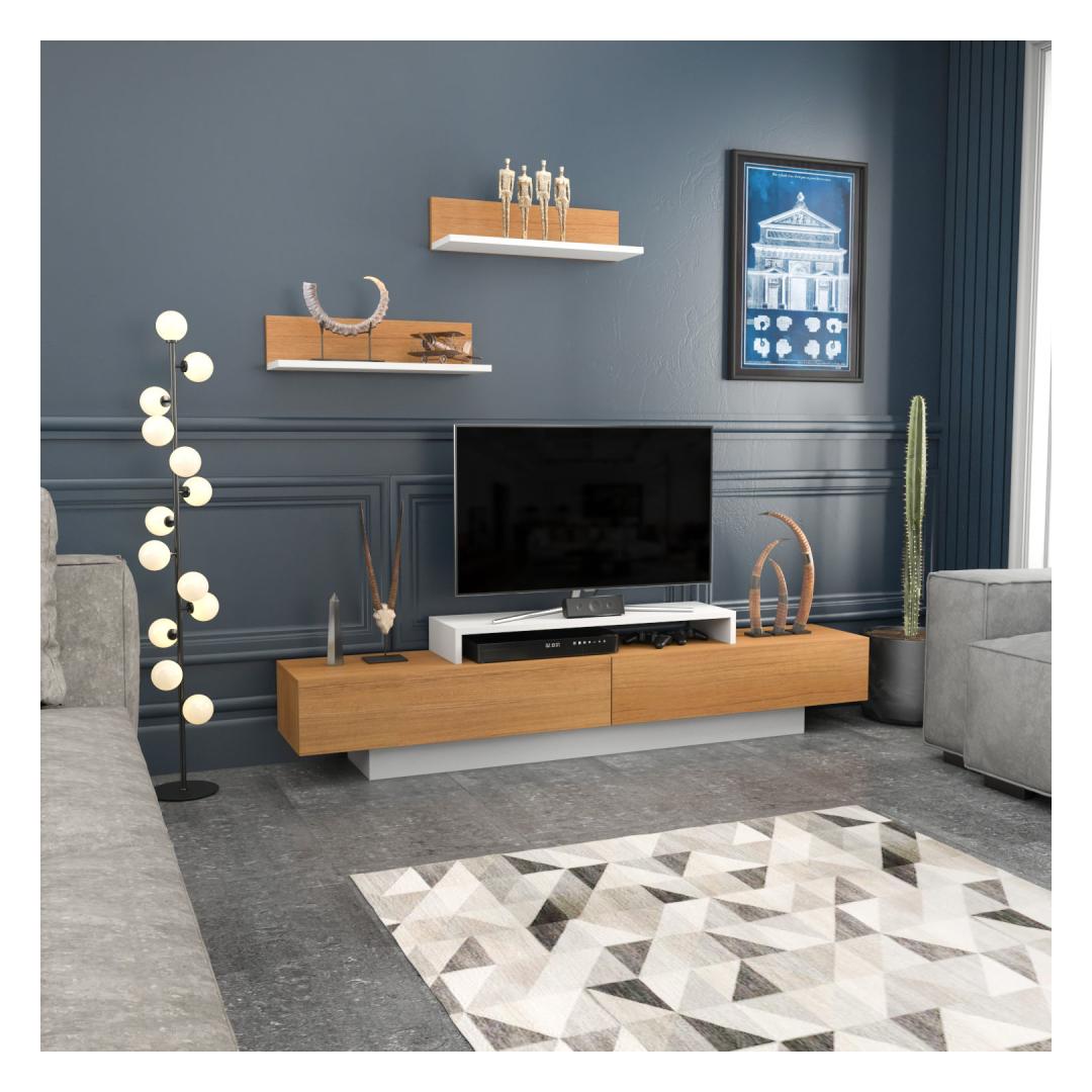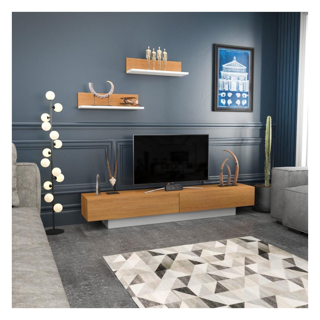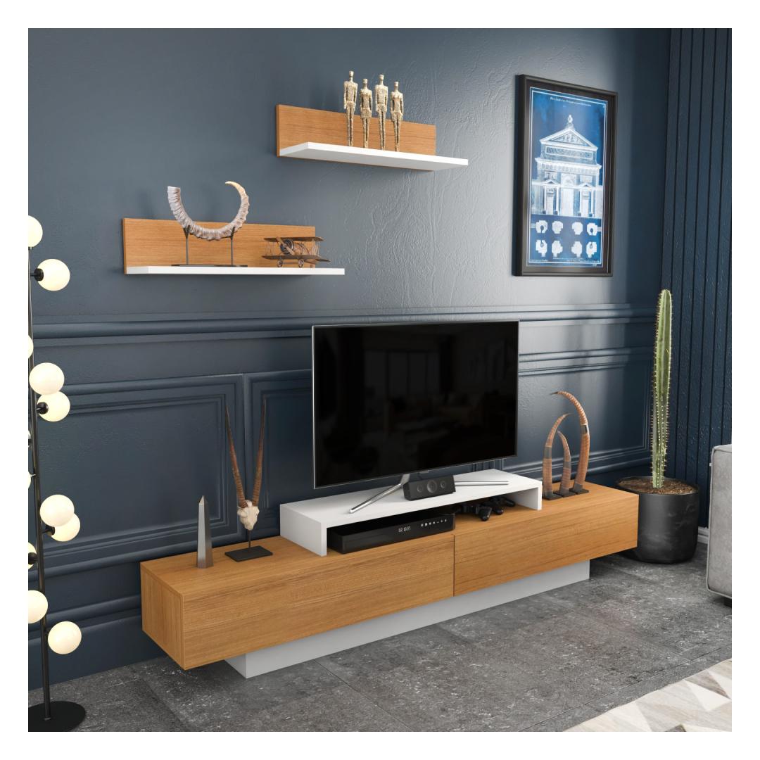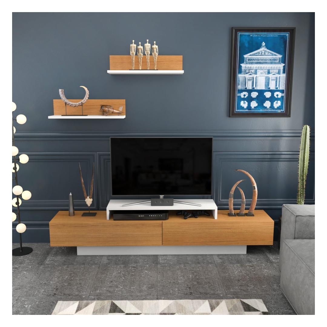 Muunna olohuoneesi modernilla ja tyylikkäällä televisiollaOletko kyllästynyt tylsään ja vanhentuneeseen olohuoneeseesi? on aika tuoda tunnelmaa ja eleganssia upealla televisiollamme. Skandinaavisen minimalismin konseptilla suunniteltu tv-kaappi kohottaa välittömästi asuintilasi estetiikkaa. Koe vertaansa vailla oleva kestävyys ja laatuTämä 100-prosenttisesti melamiinipintaisesta lastulevystä valmistettu televisio on rakennettu kestämään. sen 18 mm:n paksuus takaa lujuuden ja kestävyyden, mikä tekee siitä pitkäaikaisen investoinnin kotiisi. Sano hyvästit hauraille huonekaluille, jotka kuluvat nopeasti, ja ota vastaan TV-kaappimme tarjoama laatu. Runsaasti säilytystilaa kaikille viihdetarpeillesiTelevisiokaappimme on 180 cm leveä, 31 cm syvä ja 40 cm korkea, joten siinä on runsaasti säilytystilaa kaikille viihdetarvikkeillesi. DVD-soittimista pelikonsoleihin voit pitää kaiken siististi järjestyksessä yhdessä paikassa. Lisäksi kaksi 60 cm leveää, 18,8 cm syvää ja 15 cm korkeaa valkoista ja tiikkiä sisältävää seinähyllyä tarjoavat lisää säilytys- ja esillepanomahdollisuuksia. Täydentää kodin sisustusta tyylikkäästiValkoisen ja tiikin värikombinaatio lisää tyylikkyyttä ja hienostuneisuutta mihin tahansa kodin sisustukseen. Olipa sisustuksesi sitten moderni tai perinteinen, tämä televisio sulautuu siihen saumattomasti ja parantaa olohuoneesi yleistä estetiikkaa. On aika tehdä vaikutuksen vieraisiin moitteettomalla huonekalumakuusi. Tekniset tiedot: Tuotetyyppi.Seinähyllyn mitat: 8cm, korkeus: 15cm (2 kpl).väri: valkoinen ja teak Väri: Valkoinen teak