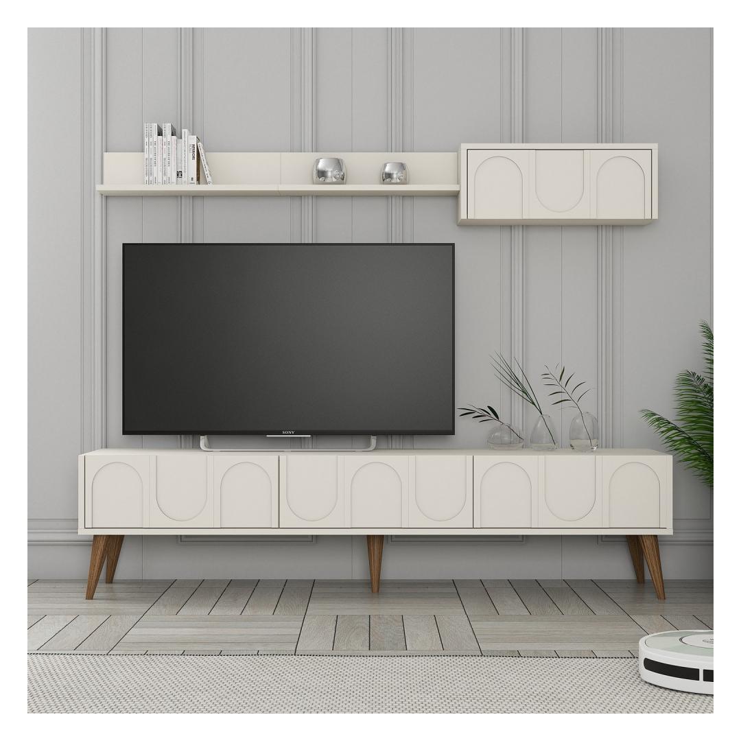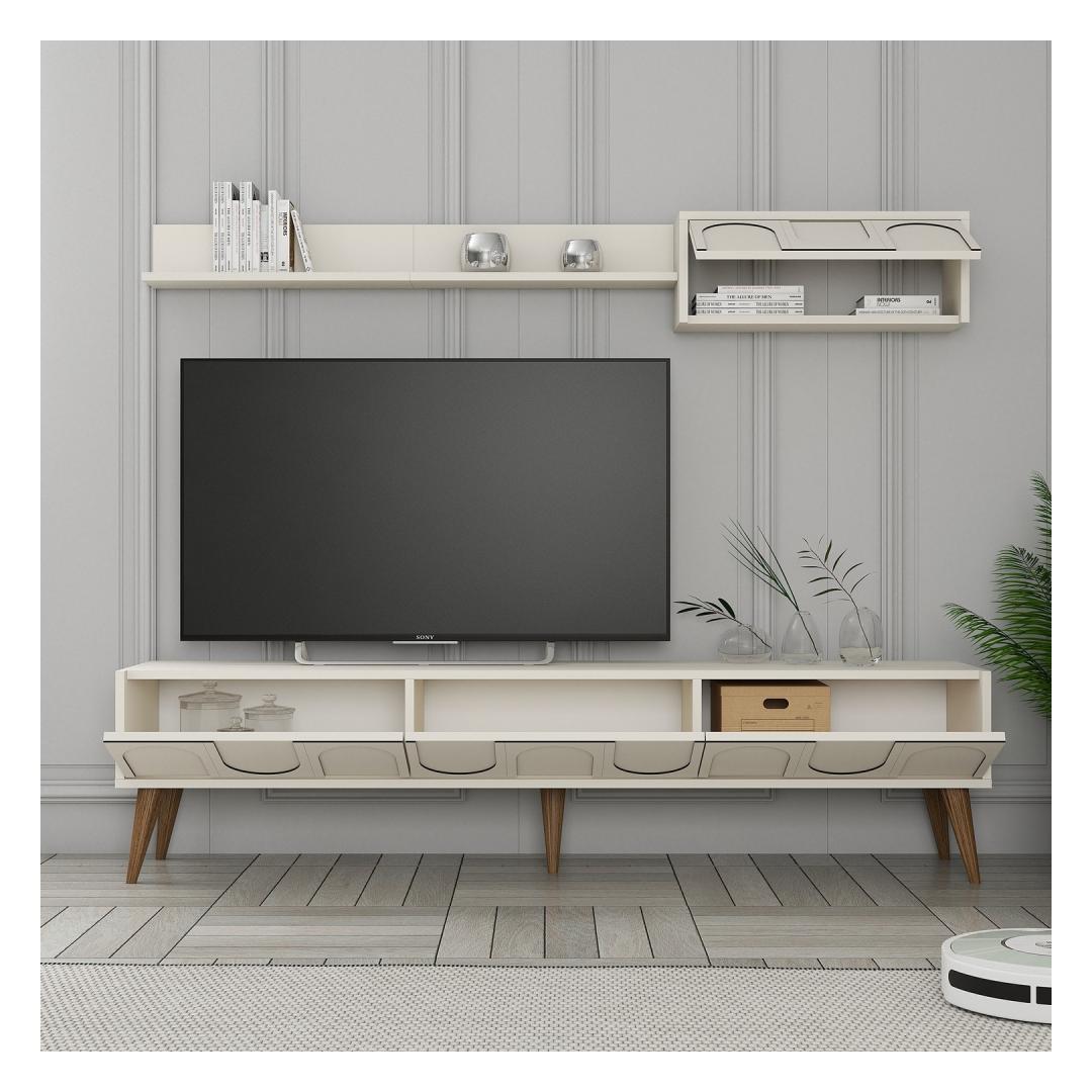 Muuda oma elutuba stiilseks ja organiseeritud ruumiks meie uimastava televiisoriga. See 100% melamiiniga kaetud puitlaastplaadist valmistatud telerikapp ei ole mitte ainult vastupidav, vaid ka uskumatult šikk. Kreem- ja pähklipuidust värvid lisavad elegantsi igasse ruumi, samas kui arvukad riiulid pakuvad piisavalt ruumi kõigile teie meelelahutuslikele esmatähtsatele asjadele. Tõstke oma eluruum ülesÜtle meie teleriga hüvasti segadusele ja tere keerukusele. Kerge disain ja moodne värvus tõstavad koheselt teie elutoa väljanägemist, muutes selle ideaalseks keskpunktiks perekondlikele koosviibimistele ja filmiõhtutele. Organiseeri stiilseltSee 180 cm laiune teleriba pakub rohkelt ruumi telerile, mängukonsoolidele ja muule. Seina riiul lisab veelgi rohkem hoiustamisvõimalusi, mis võimaldab teil oma lemmikdekoratsiooni eksponeerida või hoida dvd-d ja kaugjuhtimispuldid käeulatuses. Lihtsalt paigaldatavSeda televiisorikomplekti saab hõlpsasti seinale kinnitada, mis annab teile meelerahu, et teie meelelahutuskeskus on turvaline ja stabiilne. 18 mm paksune puitlaastplaat tagab, et see üksus peab vastu, pakkudes teile aastatepikkust naudingut. Tehnilised üksikasjad:Materjal: materjal: 100% melamiiniga kaetud puitlaastplaatPaksus: 18 mmTeleri statiivi mõõtmed: Laius: 180 cm, kõrgus: 44 cm, sügavus: 35 cm.Seina riiuli mõõtmed: laius: 180 cm, kõrgus: 24 cm, sügavus: 29. 5 cmVärv: kreem ja pähkelpuu Värv: Cream Walnut