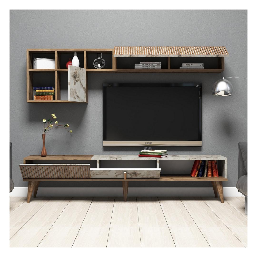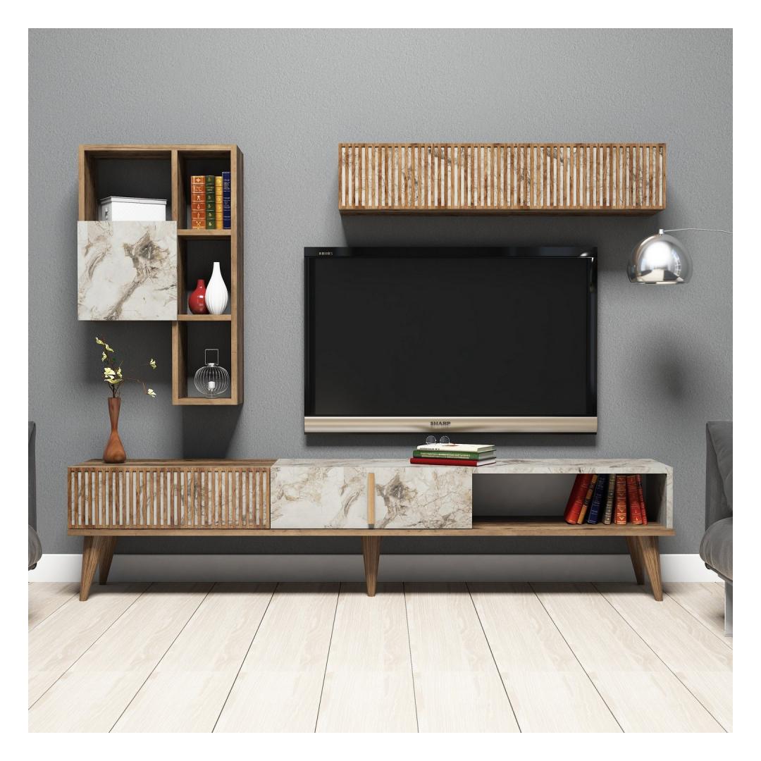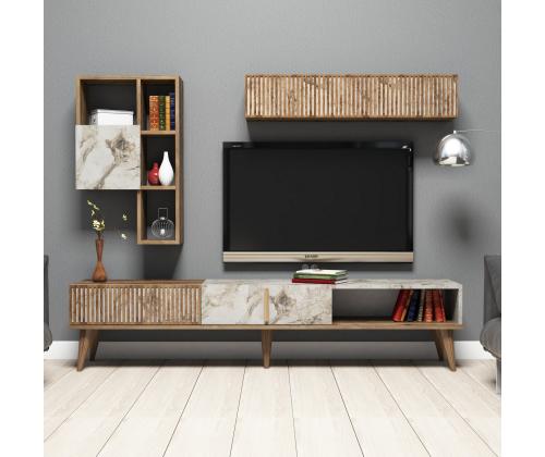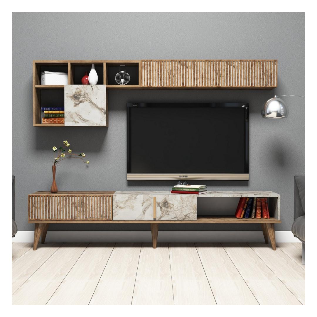 Muuda oma elutuba stiilseks ja funktsionaalseks ruumiks meie TV-üksuse abil. 100% melamiinkattega puitlaastplaadist valmistatud üksus on mitte ainult vastupidav, vaid kiirgab ka modernset ja sujuvat disaini, mis tõstab sinu kodu välimust.Tõsta oma eluruumiÜtle hüvasti segadusele ja tere korraldusele, tänu sellele TV-üksusele kuuluvatele arvukatele riiulitele. Sujuv disain ja antratsiidi ühtlane värv lisavad sinu elutuppa elegantsi, samas kui modernne ja uuenduslik kontseptsioon muudab selle sinu kodu silmapaistvaks osaks.Funktsionaalne ja stiilneTV-alus on piisavalt avar, et mahutada sinu televiisorit, samas kui seinariiulid pakuvad lisaruumi sinu meedia seadmete ja dekoratiivsete esemete jaoks. Plastjalad tagavad stabiilsuse ning võimalus kinnitada üksus seina külge lisab täiendava ohutuse kihi.Tehnilised andmed:Materjal: 100% melamiinkattega puitlaastplaatPaksus: 18 mmTV aluse suurus: Laius: 180 cm, Kõrgus: 40 cm, Sügavus: 35 cmJala kõrgus: 20 cmSeinariiuli suurus: Laius: 81 cm, Kõrgus: 48,6 cm, Sügavus: 20 cm (1 tükk)Seinariiuli suurus: Laius: 180 cm, Sügavus: 20 cm (1 tükk)Värv: Pähkel ja ValgeKontseptsioon: Ühtlane värv - Antratsiit, Modernne - Uuenduslik Värv: Walnut White