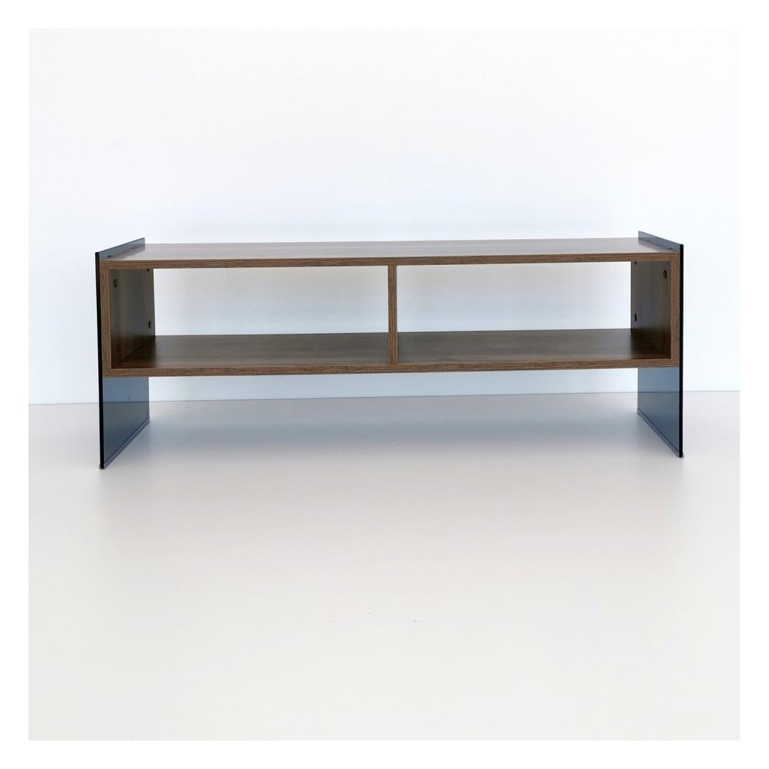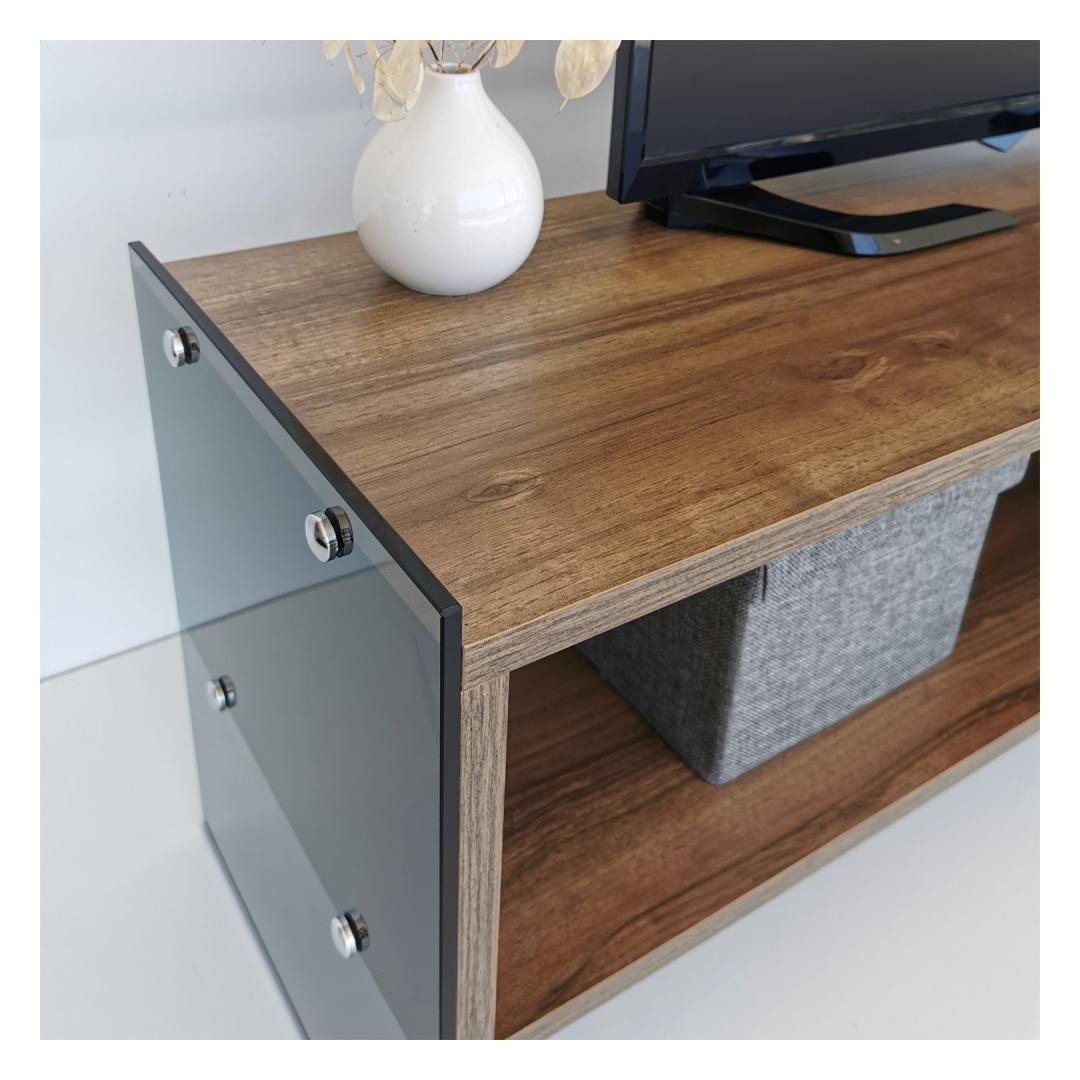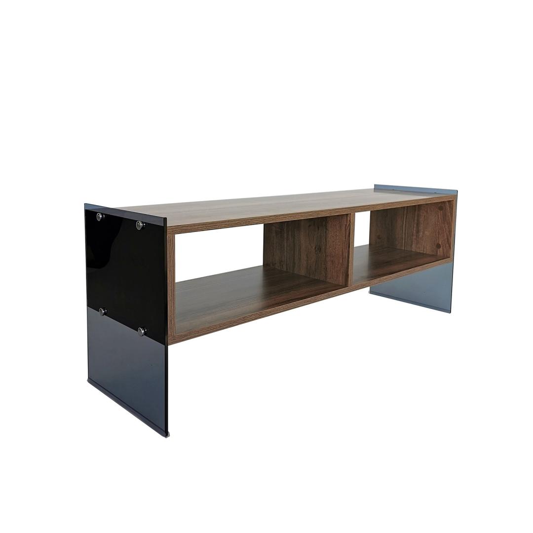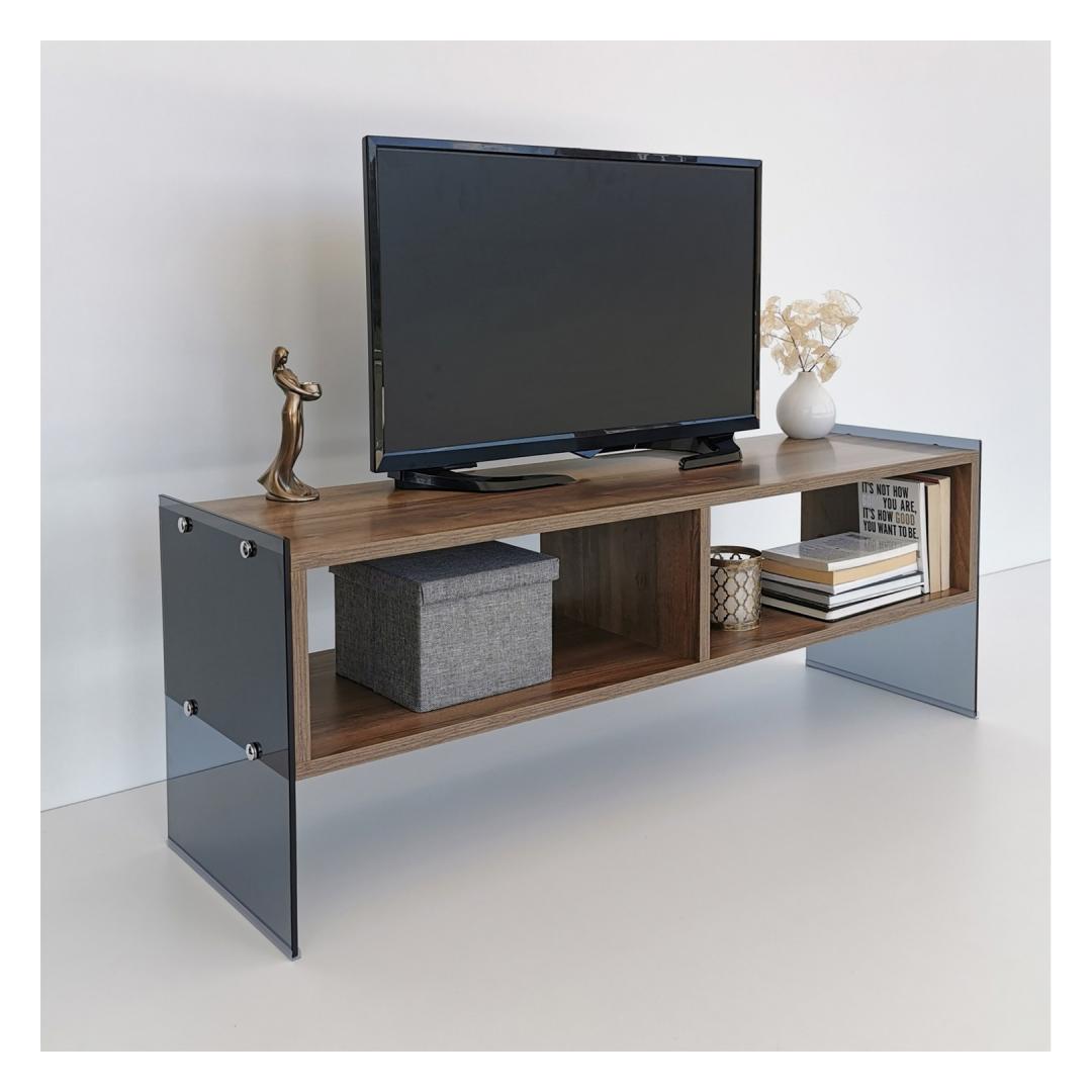 Paranna asuintilaasi modernilla ja tyylikkäällä TV-kaukosäätimelläMuuta olohuoneesi lumoavaksi ja kutsuvaksi tilaksi modernilla TV-kaukosäätimellä. Tämä äärimmäisen tarkasti valmistettu TV-konsoli yhdistää saumattomasti toiminnallisuuden ja nykyaikaisen muotoilun, mikä tekee siitä täydellisen lisän mihin tahansa kodin sisustukseen. Verraton kestävyys ja tyylikkyysTämä 100-prosenttisesti melamiinipinnoitetusta lastulevystä valmistettu TV-teline takaa pitkäaikaisen kestävyyden ja kestää naarmuja, tahroja ja kosteutta. Sen 8 mm:n paksuus lisää vahvuutta, mikä tarjoaa vakaan alustan televisiolle ja muille medialaitteille. Kehys, joka on valmistettu 100 % karkaistusta lasista, ei ainoastaan lisää tyylikkyyttä vaan takaa myös turvallisuuden. Runsaasti säilytystilaa kaikille viihdetarpeillesiLukuisten hyllyjen ansiosta tämä TV-teline tarjoaa runsaasti säilytystilaa medialaitteille, pelikonsoleille, DVD-levyille ja muulle. Pidä olohuoneesi järjestyksessä ja sotkuisena tämän monipuolisen huonekalun avulla. Lisäksi TV-teline voidaan kiinnittää seinään, mikä lisää vakautta ja mielenrauhaa. Täydellinen yhdistelmä pähkinäpuun ja savun värejäTelevisiotelineessä on kaunis yhdistelmä pähkinäpuun ja savun värejä, jotka tuovat hienostuneisuutta olohuoneeseesi. Kontrastivärit luovat visuaalisesti houkuttelevan estetiikan, joka täydentää vaivattomasti mitä tahansa sisustustyyliä, olipa se sitten moderni tai amerikkalaisen perinteinen. Tekniset tiedot: Tuotetyyppi: Materiaali: Materiaali: 100 % melamiinipinnoitettu lastulevyPaksuus: 8 mmRunko: 100 % karkaistua lasiaLeveys: 120 cmKorkeus: 45 cmKorkeus: 35 cmMaks. kantavuus: 20 kgVäri: Pähkinäpuu ja savuKonsepti: Pähkinäpuu ja savu: Moderni - uutuus, Amerikkalainen perinteinen Väri: Walnut Fume