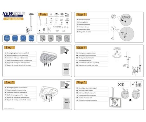 NewStar FPMA-C060BLACK -jalustassa on kaksi nivelpistettä ja se soveltuu enintään 40" (100 cm) näytöille. Tämän tuotteen painokapasiteetti on 20 kg. Kattokiinnike sopii näytöille, jotka täyttävät VESA-reikäkuvion 50x50 tai 200x200mm. Eri reikäkuviot voidaan kattaa NewStar VESA-sovitinlevyillä.