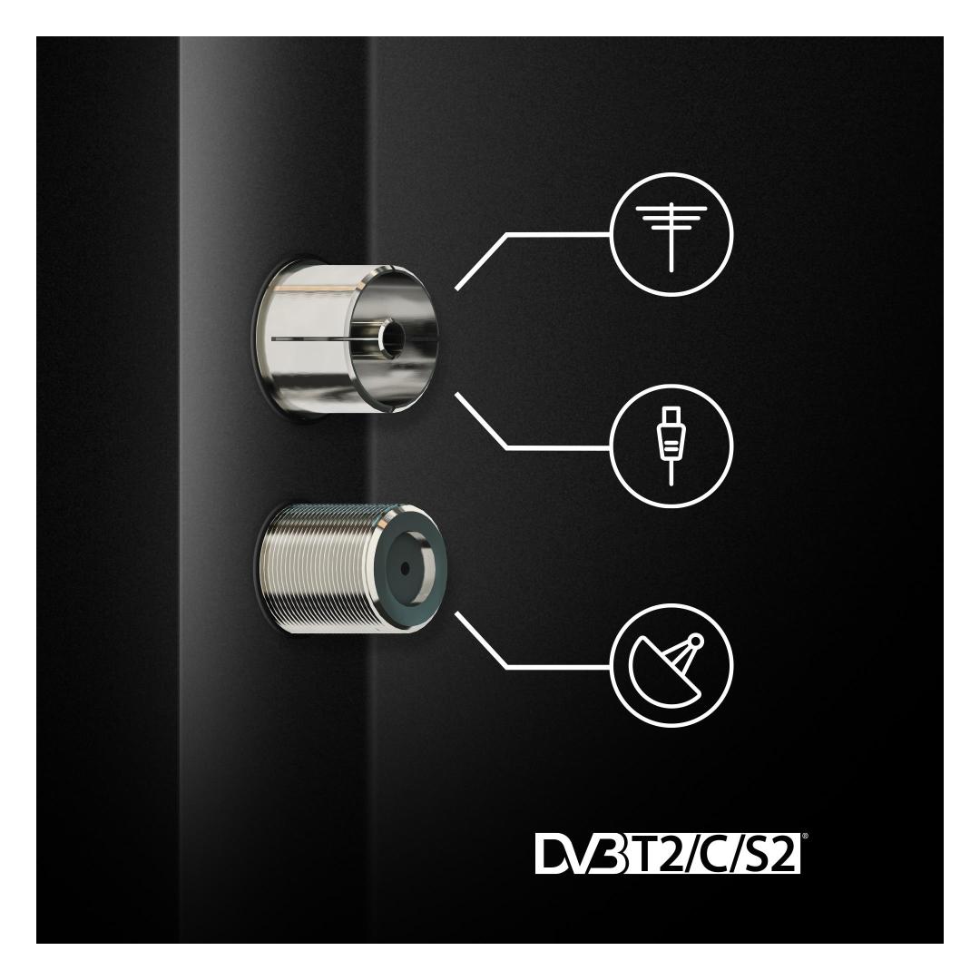 Sisäänrakennettu kolmoisviritin mahdollistaa vastaanoton satelliittiantennin, maanpäällisen antennin tai kaapelin kautta. Voit siis vastaanottaa kaikki saatavilla olevat kanavat ilman lisälaitteita.