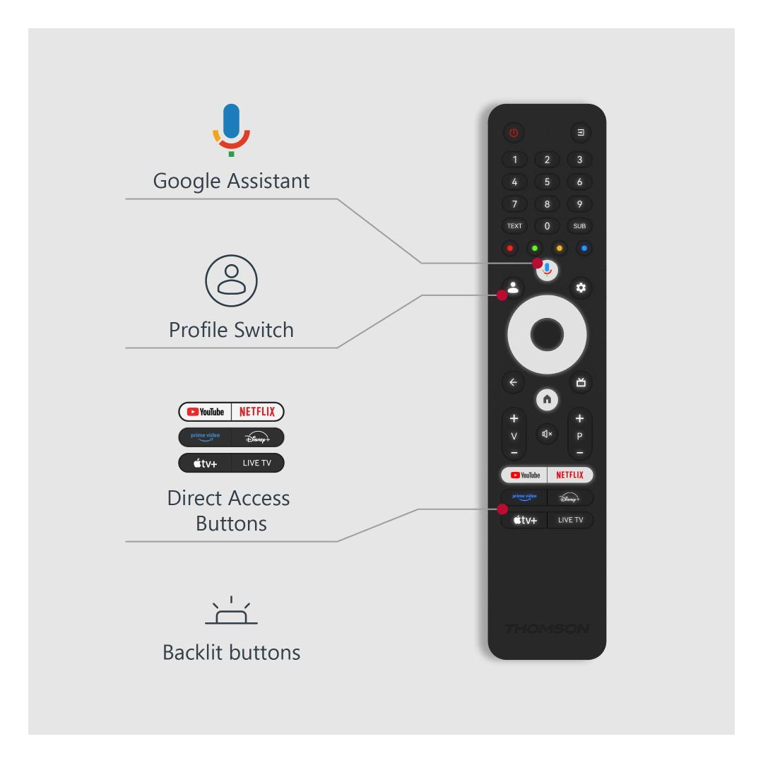 Ergonominen kaukosäädin, jossa on tasainen taustavalaistus, mahdollistaa kaiken seuraamisen myös hämärässä valaistuksessa. Ja integroidun Google Assistantin avulla voit ohjata televisiota intuitiivisesti äänikomennoilla. Etsi suosikkielokuvasi, pyydä mielialaan perustuvia suosituksia tai ohjaa yhteensopivia älylaitteita - kaikki kätevästi äänelläsi.