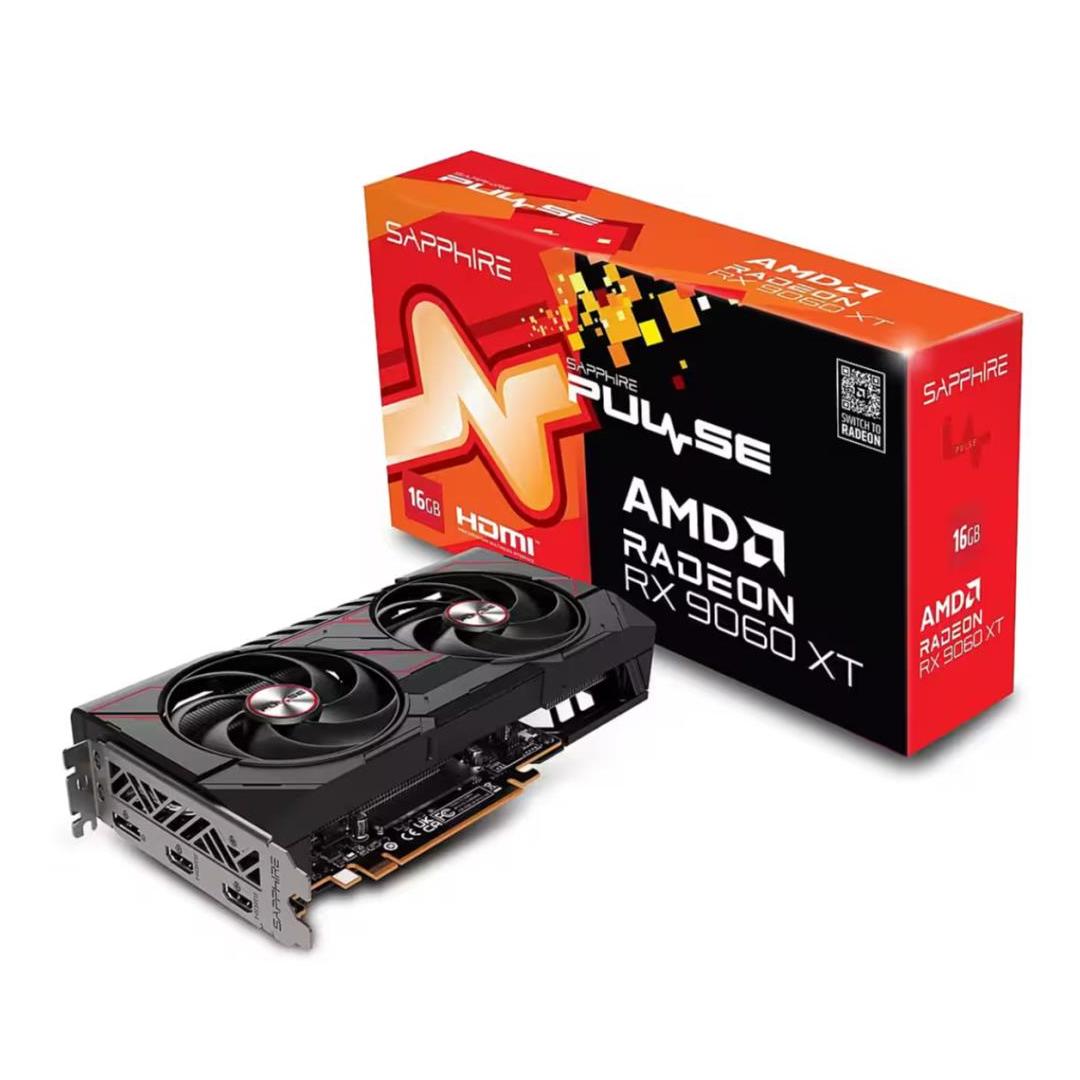 Sapphire PULSE AMD Radeon RX 9060 XT 16GB GPU. Graphics processor family: AMD, Graphics processor: Radeon RX 9060 XT. Discrete graphics card memory: 16 GB, Graphics card memory type: GDDR6, Memory bus: 128 bit. Maximum resolution: 7680 x 4320 pixels. DirectX version: 12.0, OpenGL version: 4.6. Interface type: PCI Express x16 5.0. Cooling type: Active, Number of fans: 2 fan(s)