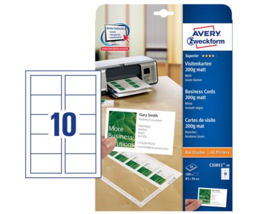 Käyntikortti AVERY ZWECKFORM 85x54mm 200g microperf. 10 arkkia matta valkoinen