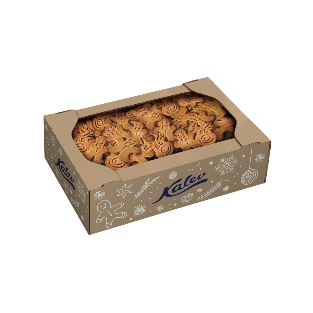 Tässä laatikossa on kokonainen kilo piparkakkumiehiä ja poronmuotoisia, herkullisen rapeita piparkakkuja. Voit myös koristella kuorrutteella.