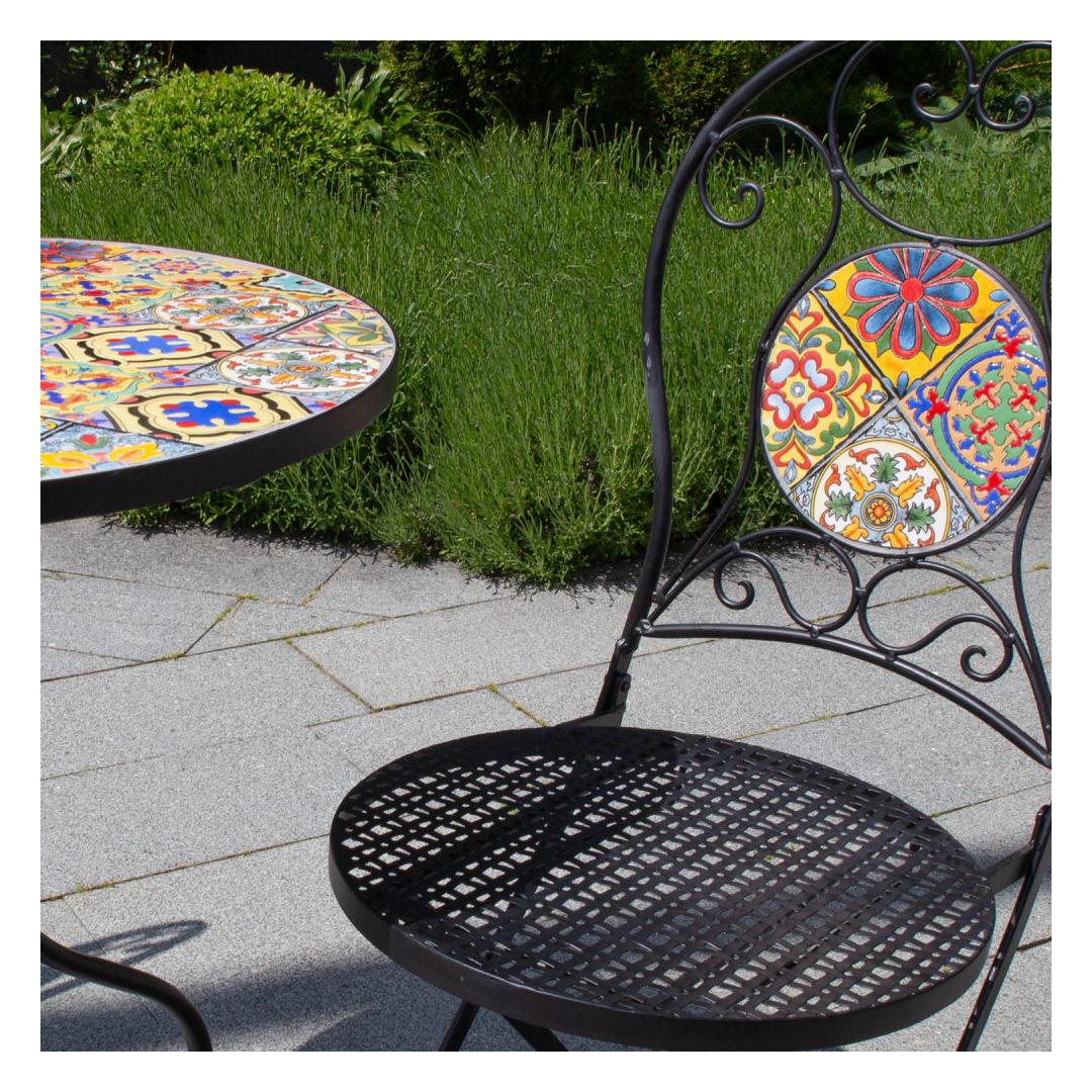 Laud MOROCCO D60xH71cm. Pöydän mosaiikkipinta on päällystetty Marokon tyyliin värillisillä keraamisilla laatoilla. Jalat ja runko on valmistettu metallista ja viimeistelty mustaksi pulverimaalattuna. Laud MOROCCO D60xH71cm. Laua mosaiikplaat on kaetud Morocco stiilis värviliste keraamiliste plaatidega. Laua jalad ja raam on valmistatud metallist ja viimistletud musta pulbervärviga.