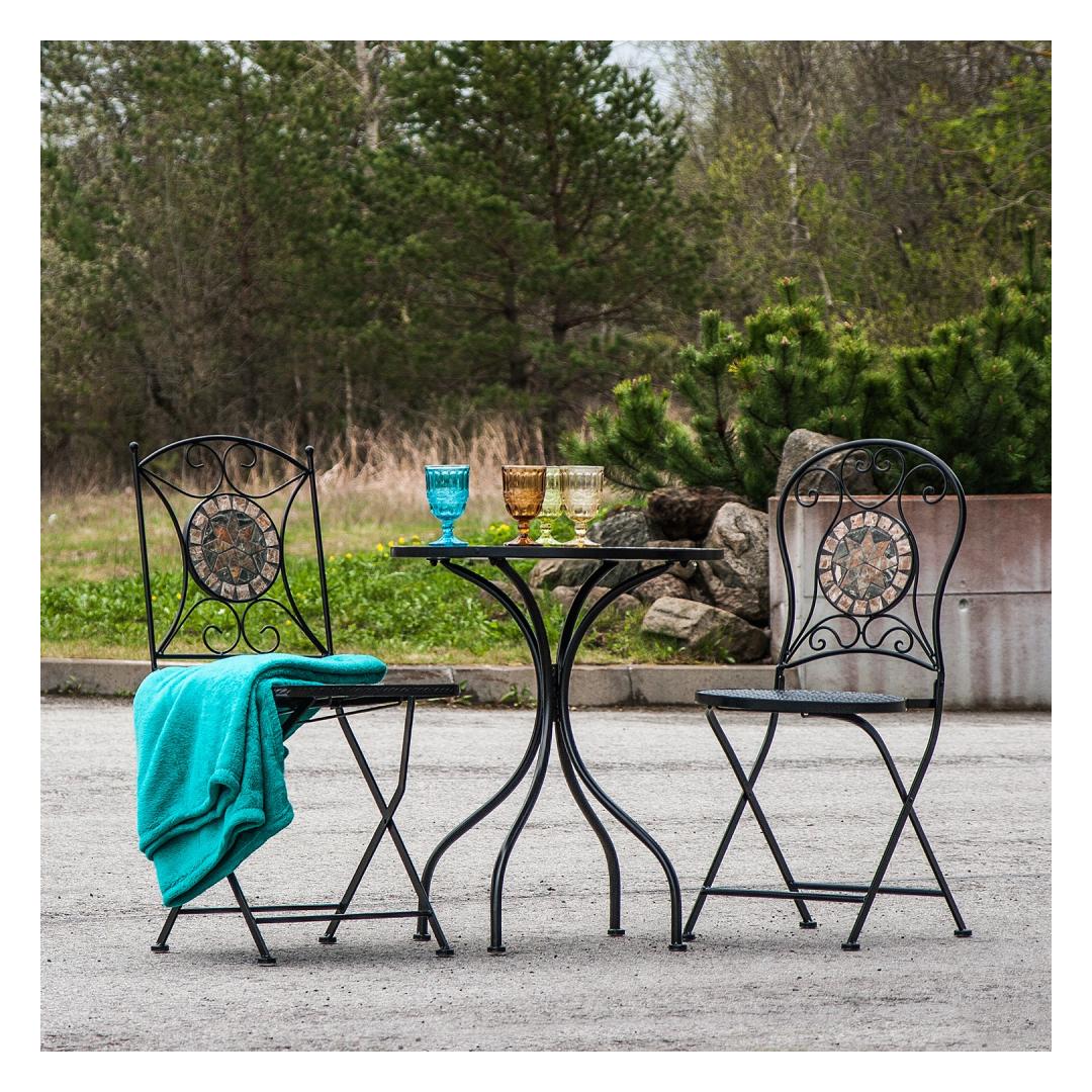 Parvekesetti MOSAIC pöytä ja 2 tuolia. Pöydän mosaiikkipinta ja taittuvien tuolien selkänojat on koristeltu ruskean ja harmaan sävyisillä keraamisilla laatoilla. Pöydän ja tuolien jalat ja runko on valmistettu metallista ja viimeistelty mustalla pulverimaalilla. Pöydän mitat ovat D60xH70cm. Tuolien kokonaismitat ovat 39x53xH90cm. Istuimen leveys 37,5cm, istuimen syvyys 38cm, istuimen korkeus 46cm. Painoraja 90kg. Tuolin mitat kokoon taitettuna ovat 38x100x11cm. HUOLTO JA HOITO: Metallikalusteet ovat käytännössä huoltovapaita, säännöllinen puhdistus riittää. Kesäkauden päätyttyä suosittelemme puutarhakalusteiden säilyttämistä sisätiloissa. Kesäkauden jälkeen kalusteet tulisi säilyttää puutarhassa. Käytä säilytykseen kuivaa ja hyvin ilmastoitua tilaa. Parvekesetti MOSAIC pöytä ja 2 tuolia. Pöydän mosaiikkipinta ja taittuvien tuolien selkänojat on koristeltu ruskean ja harmaan sävyisillä keraamisilla laatoilla. Pöydän ja tuolien jalat ja runko on valmistettu metallista ja viimeistelty mustalla pulverimaalilla. Pöydän mitat ovat D60xH70cm. Tuolien kokonaismitat ovat 39x53xH90cm. Istuimen leveys 37,5cm, istuimen syvyys 38cm, istuimen korkeus 46cm. Painoraja 90kg. Tuolin mitat kokoon taitettuna ovat 38x100x11cm. HUOLTO JA HOITO: Metallikalusteet ovat käytännössä huoltovapaita, säännöllinen puhdistus riittää. Kesäkauden päätyttyä suosittelemme puutarhakalusteiden säilyttämistä sisätiloissa. Kesäkauden jälkeen kalusteet tulisi säilyttää puutarhassa. Käytä säilytykseen kuivaa ja hyvin ilmastoitua tilaa.