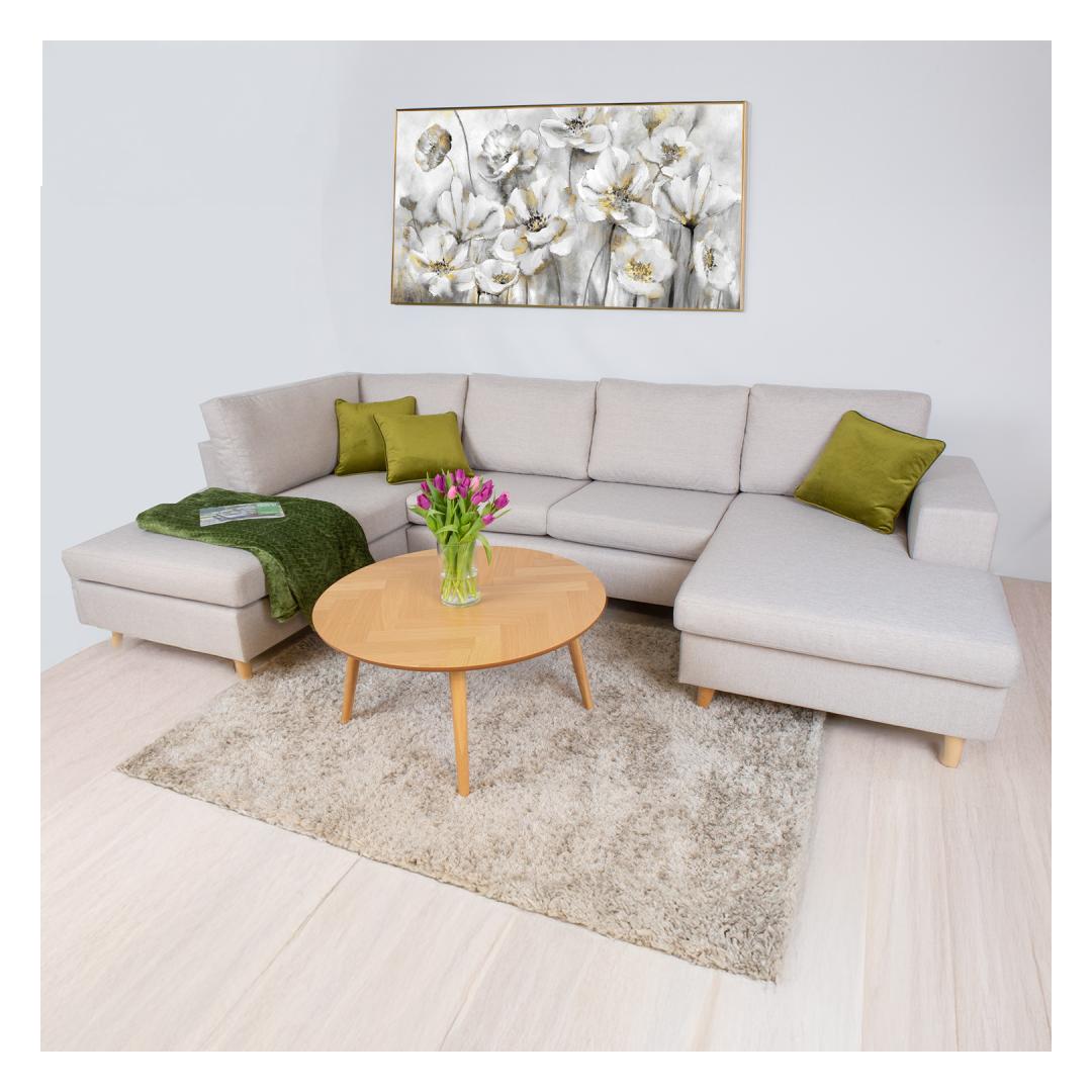 Kulmasohva HARALD vasen kulma, beige. Suuri U-muotoinen kulmasohva kiehtoo selkeällä ja neutraalilla muotoilullaan ja sopii täydellisesti erilaisiin sisustustyyleihin. Miellyttävän pehmeiden tyynyjen ansiosta sohva on täydellinen paikka rentoutumiseen, ja siihen mahtuu tarvittaessa suuri määrä istuvia henkilöitä. Runko on valmistettu koivuvanerista ja massiivipuusta. Istumismukavuudesta huolehtii siksak-jousitus. Kaikki istuintyynyt ovat irrotettavia. Istuintyynyjen sisällä on kestävä HR-vaneriverhoilu, joka on päällystetty pehmeällä polyesterivaahdolla. Irralliset selkänojatyynyt on täytetty murskatulla poroloneilla. Istuin- ja selkänojatyynynpäälliset ovat irrotettavia ja pestäviä. Sohvan runko ja tyynyt on verhoiltu laadukkaalla verhoilukankaalla, Martindale-arvo 90 000 - 100 000. Sohvan kokonaismitat ovat 318x185/140xH92cm. Pisin kulma on etukuvassa vasemmalla puolella. Sohvan korkeus runkoon on 73cm. Istuimen korkeus 47cm. Istuimen syvyys 50cm. Istuintyynyt 90/70x167xH15cm, 93/68x126xH15cm. Medium-istuintyynyjen mitat 70x65xH15cm/2kpl. Selkänojatyynyjen mitat 70x48x18cm/3kpl, 97/83x48x18cm/1kpl ja 80/68x48xH18cm/1kpl. Sohvassa on puiset jalat. Jalat ovat 13cm korkeat. Sohva on valmistettu Virossa. Nurgadiivan HARALD vasak nurk, beež.
