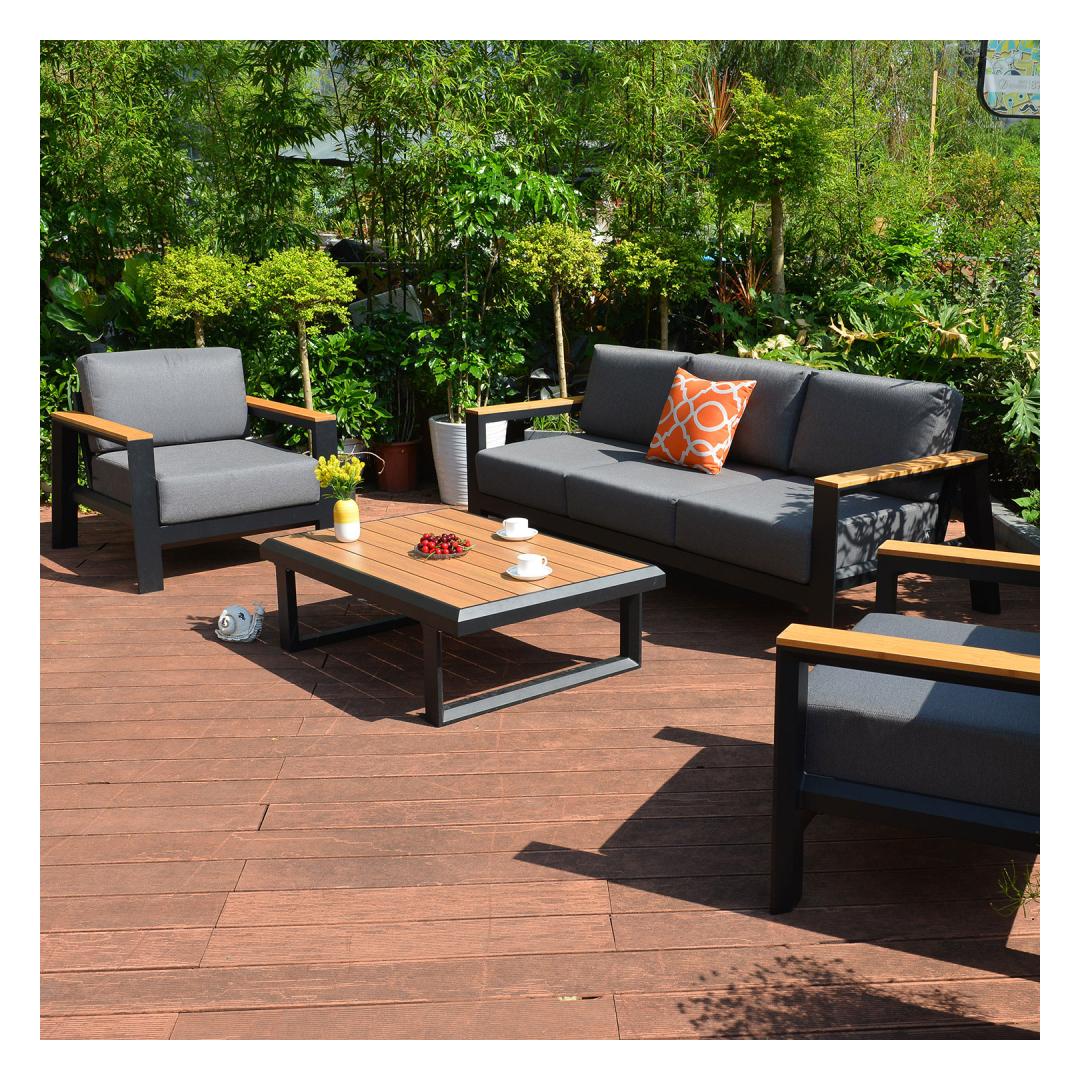 Puutarhakalustesarja FELINO, jossa pöytä, sohva ja 2 nojatuolia, musta. Sarjan kaikkien osien tukeva perusrakenne on valmistettu alumiinista ja viimeistelty mustalla pulverimaalilla. Pöytälevy sekä nojatuolin ja sohvan käsinojat on valmistettu teakinvärisestä tekopuusta. Paksut harmaat tyynyt takaavat erinomaisen istuinmukavuuden. Tyynynpäälliset on valmistettu olefiinikankaasta, jonka säänkestävyys on erinomainen. Sarja sisältää 2 nojatuolin istuintyynyä 70x70x18cm, 2 selkätyynyä 70x40x12cm ja 3 sohvan istuintyynyä 70x64x18cm, 3 selkätyynyä 65x40x12cm. Pöydän mitat 117x80xK37cm. Sohvan mitat 215x96xH71cm, nojatuolin mitat 90x96xH71cm. Tuote on erittäin kestävä vaihtelevissa sääolosuhteissa ja helppo huoltaa. Ainoastaan tyynyt tarvitsevat suojaa säältä. Tyynyliina on hyvä ratkaisu patjojen päivittäiseen säilytykseen ja kuivana pitämiseen. Ulkokalusteiden käyttöiän pidentämiseksi suosittelemme ulkokalustesuojien käyttöä. HUOLTO: Kesäkauden päätyttyä suosittelemme puutarhakalusteiden säilyttämistä sisätiloissa. Kesäkauden päätyttyä suosittelemme jättämään huonekalut puutarhaan talvikuukausiksi. Käytä säilytykseen kuivaa ja hyvin ilmastoitua tilaa. Puutarhakalustesarja FELINO, jossa pöytä, sohva ja 2 nojatuolia, musta. Sarjan kaikkien osien tukeva perusrakenne on valmistettu alumiinista ja viimeistelty mustalla pulverimaalilla. Pöytälevy sekä nojatuolin ja sohvan käsinojat on valmistettu teakinvärisestä tekopuusta. Paksut harmaat tyynyt takaavat erinomaisen istuinmukavuuden. Tyynynpäälliset on valmistettu olefiinikankaasta, jonka säänkestävyys on erinomainen. Sarja sisältää 2 nojatuolin istuintyynyä 70x70x18cm, 2 selkätyynyä 70x40x12cm ja 3 sohvan istuintyynyä 70x64x18cm, 3 selkätyynyä 65x40x12cm. Pöydän mitat 117x80xK37cm. Sohvan mitat 215x96xH71cm, nojatuolin mitat 90x96xH71cm. Tuote on erittäin kestävä vaihtelevissa sääolosuhteissa ja helppo huoltaa. Ainoastaan tyynyt tarvitsevat suojaa säältä. Tyynyliina on hyvä ratkaisu patjojen päivittäiseen säilytykseen ja kuivana pitämiseen. Ulkokalusteiden käyttöiän pidentämiseksi suosittelemme ulkokalustesuojien käyttöä. HUOLTO: Kesäkauden päätyttyä suosittelemme puutarhakalusteiden säilyttämistä sisätiloissa. Kesäkauden päätyttyä suosittelemme jättämään huonekalut puutarhaan talvikuukausiksi. Käytä säilytykseen kuivaa ja hyvin ilmastoitua tilaa.