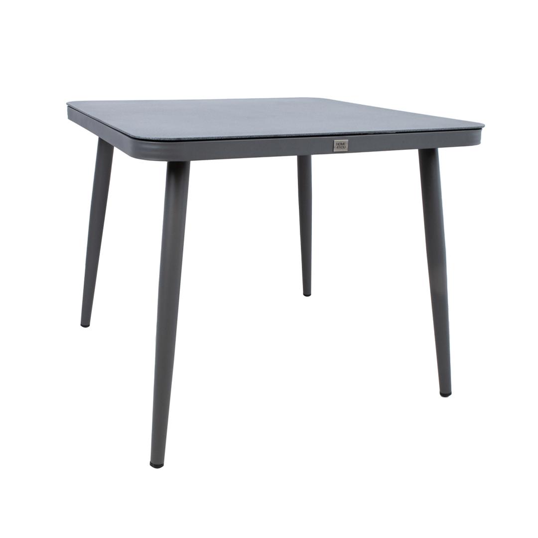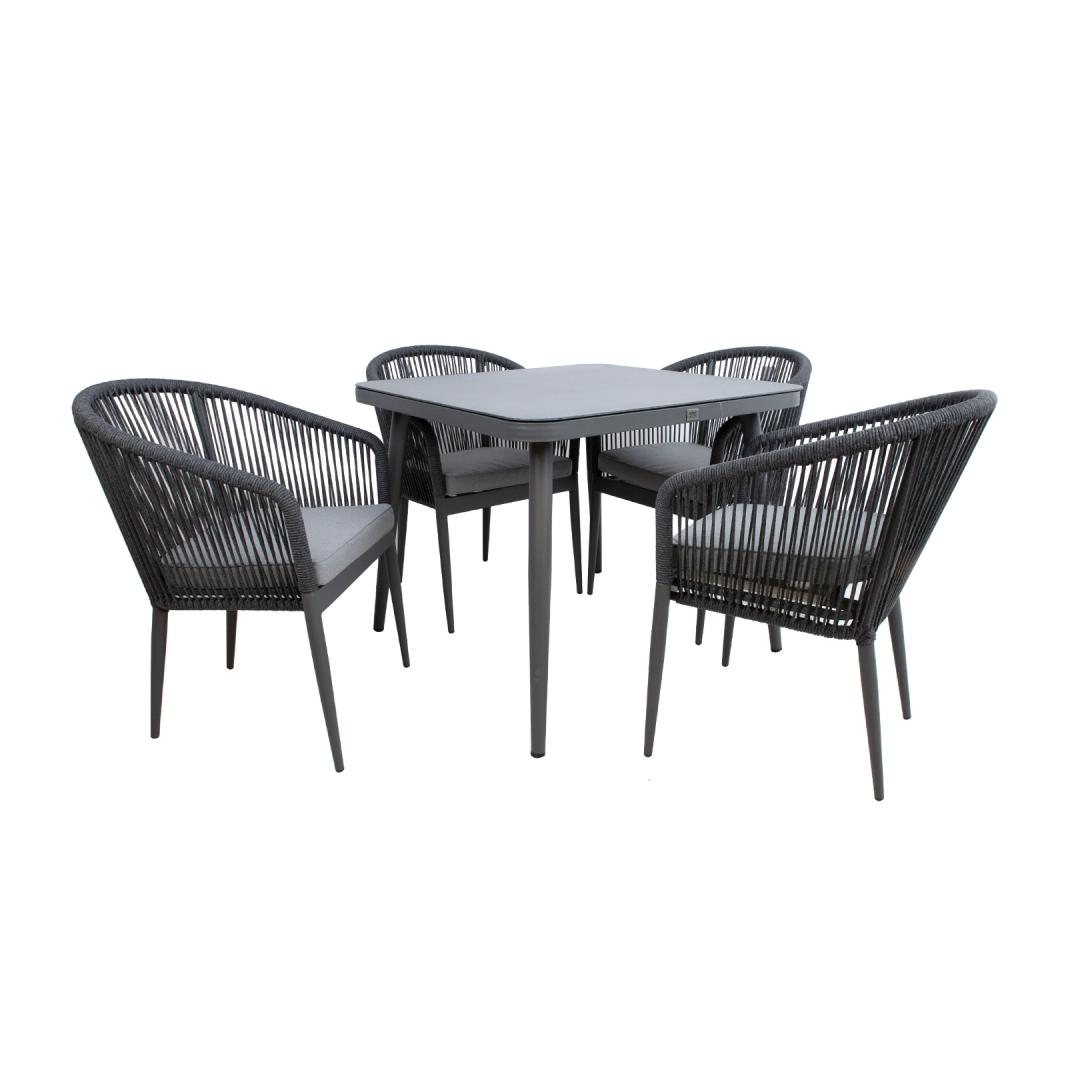 Puutarhakalustesarja ECCO pöytä ja 4 tuolia. Pöydän mitat ovat 90x90xK75cm. Pöytälevy: 5mm harmaa, karkaistu lasi, joka muistuttaa kiveä. Pöydän ja tuolien jalat ja runko on valmistettu alumiinista ja viimeistelty harmaalla pulverimaalilla. Tuolien selkänoja ja käsinojat on päällystetty narupunoksella. Istuintyyny sisältyy. Tyynynpäällinen on valmistettu polyesterikankaasta. Tyynyn mitat 45x42x5cm. Istuimen jalusta on tuettu alumiinilistoilla. Tuolin mitat 57x65xH81cm, istuimen korkeus 44cm. Painoraja 100kg. Tuolit ovat pinottavia helppoa ja tilaa säästävää säilytystä varten. Tuote on kestävä vaihtelevissa sääolosuhteissa ja helppo huoltaa. Suosittelemme ulkokalustesuojien käyttöä ulkokalusteiden käyttöiän pidentämiseksi. HUOLTO: Kesäkauden päätyttyä suosittelemme puutarhakalusteiden säilyttämistä sisätiloissa. Kesäkauden päätyttyä suosittelemme jättämään kalusteet puutarhaan talvikuukausiksi. Käytä säilytykseen kuivaa ja hyvin ilmastoitua tilaa. Puutarhakalustesarja ECCO pöytä ja 4 tuolia. Pöydän mitat ovat 90x90xK75cm. Pöytälevy: 5mm harmaa, karkaistu lasi, joka muistuttaa kiveä. Pöydän ja tuolien jalat ja runko on valmistettu alumiinista ja viimeistelty harmaalla pulverimaalilla. Tuolien selkänoja ja käsinojat on päällystetty narupunoksella. Istuintyyny sisältyy. Tyynynpäällinen on valmistettu polyesterikankaasta. Tyynyn mitat 45x42x5cm. Istuimen jalusta on tuettu alumiinilistoilla. Tuolin mitat 57x65xH81cm, istuimen korkeus 44cm. Painoraja 100kg. Tuolit ovat pinottavia helppoa ja tilaa säästävää säilytystä varten. Tuote on kestävä vaihtelevissa sääolosuhteissa ja helppo huoltaa. Suosittelemme ulkokalustesuojien käyttöä ulkokalusteiden käyttöiän pidentämiseksi. HUOLTO: Kesäkauden päätyttyä suosittelemme puutarhakalusteiden säilyttämistä sisätiloissa. Kesäkauden päätyttyä suosittelemme jättämään kalusteet puutarhaan talvikuukausiksi. Käytä säilytykseen kuivaa ja hyvin ilmastoitua tilaa.