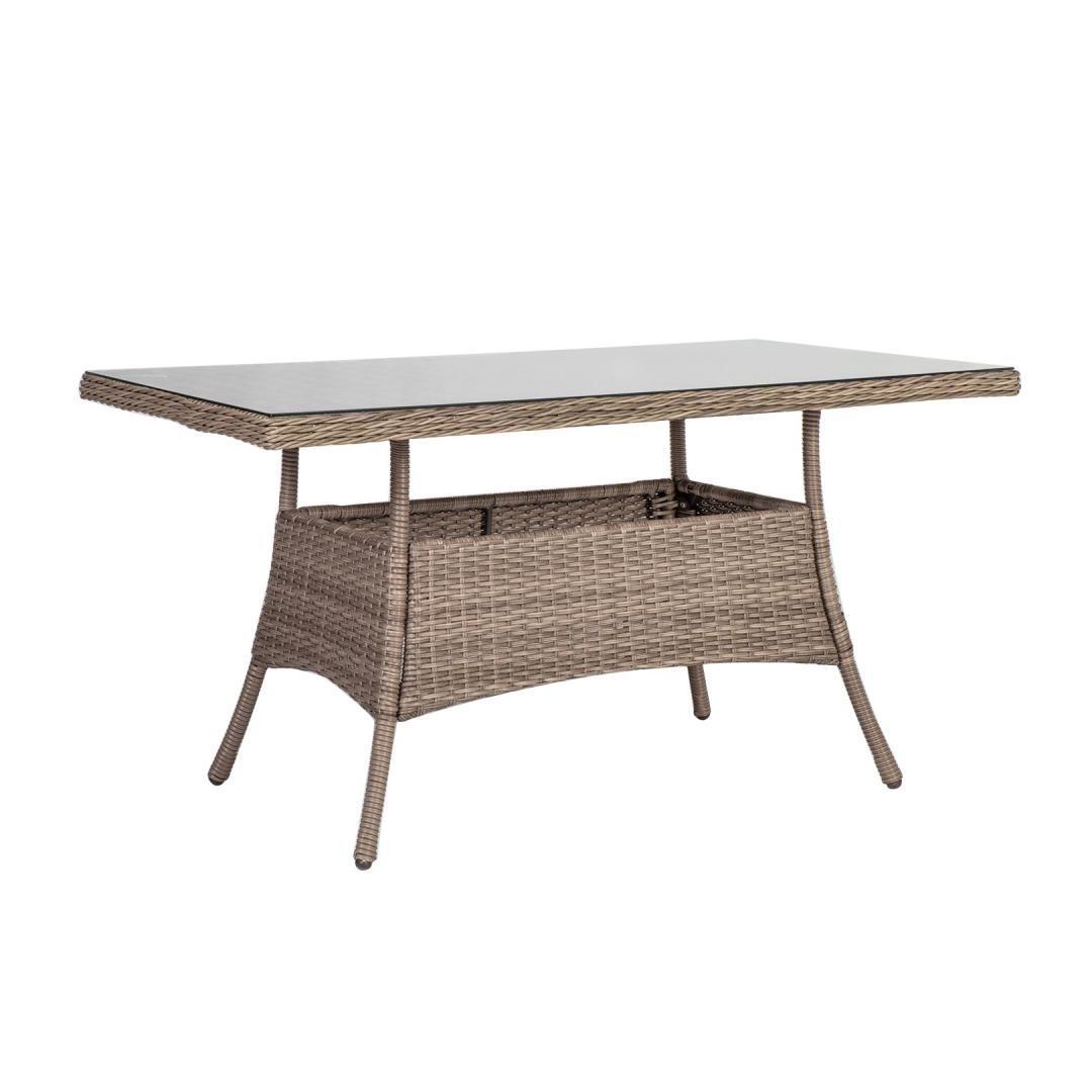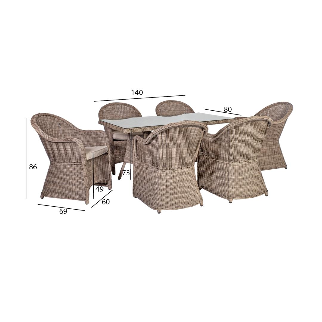 Puutarhakalustesarja TOSCANA pöytä ja 6 tuolia. Pöydän mitat ovat 140x80xK73cm. Pöytälevy. Pöydän ja tuolien pulverimaalattu alumiinirunko päällystetty beigellä muovipunoksella. Tuolien mitat 60x69xH86cm. Mukana istuintyynyt. Tyynynpäällinen beigeä polyesterikangasta. Tyynyn paksuus 5cm. Painoraja 100kg. Tuote kestää hyvin vaihtelevia sääolosuhteita eikä vaadi erityistä hoitoa. Ainoastaan tyynyt tarvitsevat suojaa säältä. Ulkokalusteiden käyttöiän pidentämiseksi suosittelemme ulkokalustesuojien käyttöä. HUOLTO: Kesäkauden päätyttyä suosittelemme puutarhakalusteiden säilyttämistä sisätiloissa. Kesäkauden päätyttyä suosittelemme jättämään huonekalut puutarhaan talvikuukausiksi. Käytä säilytykseen kuivaa ja hyvin ilmastoitua tilaa. Puutarhakalustesarja TOSCANA pöytä ja 6 tuolia. Pöydän mitat ovat 140x80xK73cm. Pöytälevy. Pöydän ja tuolien pulverimaalattu alumiinirunko päällystetty beigellä muovipunoksella. Tuolien mitat 60x69xH86cm. Mukana istuintyynyt. Tyynynpäällinen beigeä polyesterikangasta. Tyynyn paksuus 5cm. Painoraja 100kg. Tuote kestää hyvin vaihtelevia sääolosuhteita eikä vaadi erityistä hoitoa. Ainoastaan tyynyt tarvitsevat suojaa säältä. Ulkokalusteiden käyttöiän pidentämiseksi suosittelemme ulkokalustesuojien käyttöä. HUOLTO: Kesäkauden päätyttyä suosittelemme puutarhakalusteiden säilyttämistä sisätiloissa. Kesäkauden päätyttyä suosittelemme jättämään huonekalut puutarhaan talvikuukausiksi. Käytä säilytykseen kuivaa ja hyvin ilmastoitua tilaa.