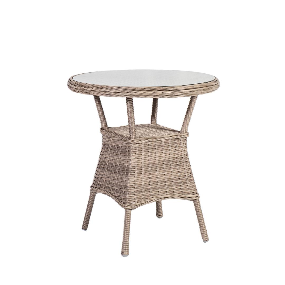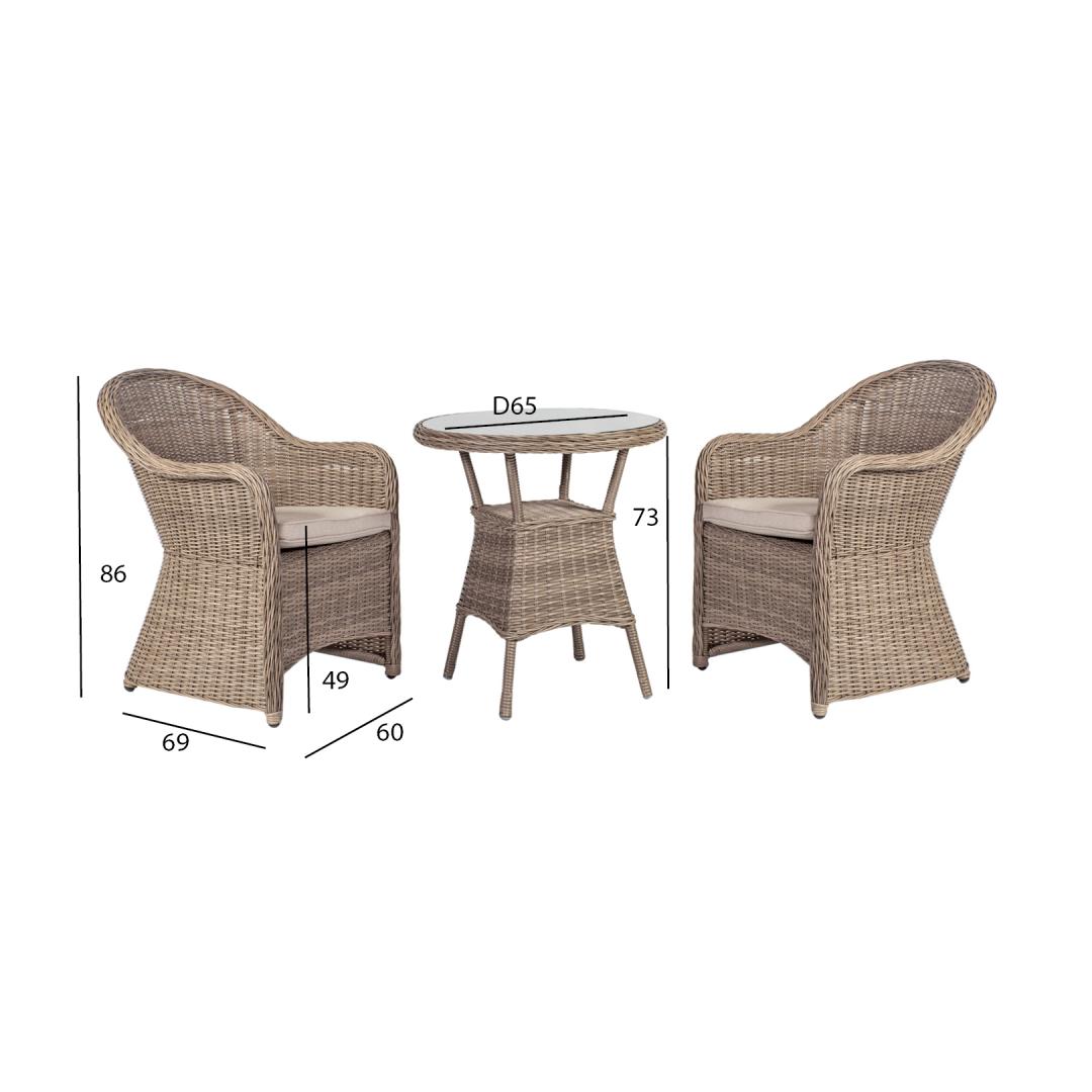 Puutarhakalustesarja TOSCANA pöytä ja 2 tuolia. Pöydän mitat D65xH73cm. Pöytälevy: 5mm kirkasta karkaistua lasia. Pöydän ja tuolien pulverimaalattu alumiinirunko, joka on päällystetty beigellä muovipunoksella. Tuolien mitat 60x69xK86cm. Mukana istuintyynyt. Tyynynpäällinen beigeä polyesterikangasta. Tyynyn paksuus 5cm. Painoraja 100kg. Tuote kestää hyvin vaihtelevia sääolosuhteita eikä vaadi erityistä hoitoa. Ainoastaan tyynyt tarvitsevat suojaa säältä. Ulkokalusteiden käyttöiän pidentämiseksi suosittelemme ulkokalustesuojien käyttöä. HUOLTO: Kesäkauden päätyttyä suosittelemme puutarhakalusteiden säilyttämistä sisätiloissa. Kesäkauden päätyttyä suosittelemme jättämään huonekalut puutarhaan talvikuukausiksi. Käytä säilytykseen kuivaa ja hyvin ilmastoitua tilaa. Puutarhakalustesarja TOSCANA pöytä ja 2 tuolia. Pöydän mitat D65xH73cm. Pöytälevy: 5mm kirkasta karkaistua lasia. Pöydän ja tuolien pulverimaalattu alumiinirunko, joka on päällystetty beigellä muovipunoksella. Tuolien mitat 60x69xK86cm. Mukana istuintyynyt. Tyynynpäällinen beigeä polyesterikangasta. Tyynyn paksuus 5cm. Painoraja 100kg. Tuote kestää hyvin vaihtelevia sääolosuhteita eikä vaadi erityistä hoitoa. Ainoastaan tyynyt tarvitsevat suojaa säältä. Ulkokalusteiden käyttöiän pidentämiseksi suosittelemme ulkokalustesuojien käyttöä. HUOLTO: Kesäkauden päätyttyä suosittelemme puutarhakalusteiden säilyttämistä sisätiloissa. Kesäkauden päätyttyä suosittelemme jättämään huonekalut puutarhaan talvikuukausiksi. Käytä säilytykseen kuivaa ja hyvin ilmastoitua tilaa.