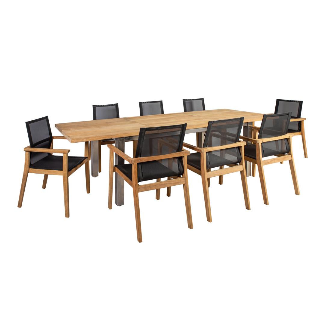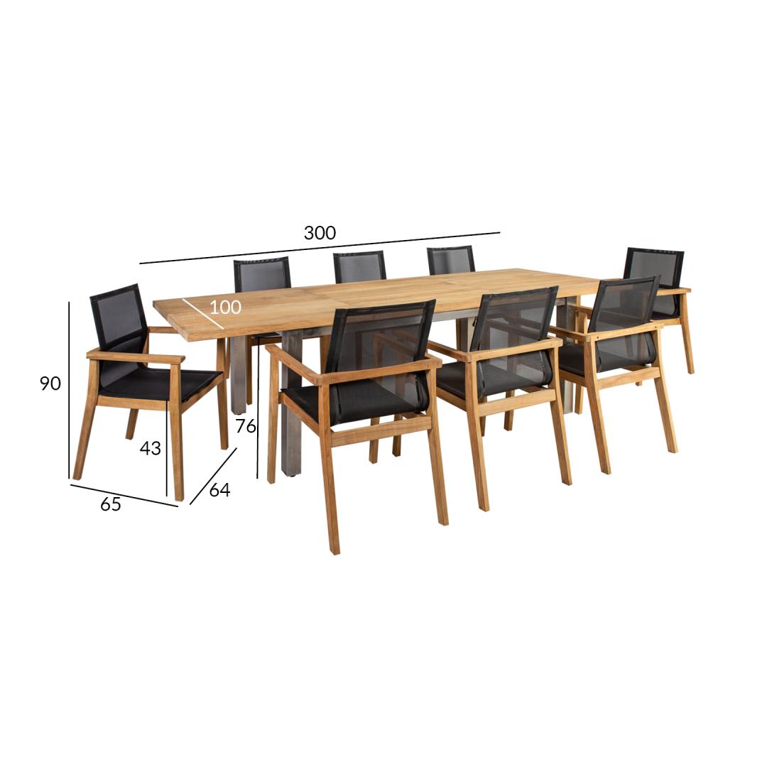 Ruokasetti NAUTICA pöytä ja 8 tuolia. Pöydän mitat 200/300x100xK76cm. Pöytä on jatkettavissa keskeltä. keskellä oleva 100cm leveä taittuva jatkopala sijaitsee pöytälevyn alla. Pöytälevy on valmistettu A-luokan teakista. Hienoksi kiillotettu, maalaismainen pinta on täysin luonnollisen kaunis, eikä sitä ole öljytty tai muuten kemiallisesti käsitelty. Pöydän jalat ja jalustakehikko on valmistettu ruostumattomasta teräksestä. A-luokan teak on täydellinen luonnonmateriaali ylellisiin ulkokalusteisiin. Puulla on tiheä ja tasainen puunrunko, jossa on kaunis samettinen kiilto, ja se on väriltään kultaista vehnää ja metonya. Korkean luonnollisten öljyjen pitoisuutensa ansiosta teak kestää hyvin kosteutta ja puutuholaisia. Se kestää hyvin monenlaisia sääolosuhteita ja säilyttää erinomaisen ulkonäkönsä ja parhaat ominaisuutensa useita vuosia. Auringonvalo ja kosteus muuttavat pöydän pinnan ajan myötä kauniiksi hopeanharmaaksi. Tämä värimuutos on luonnollista eikä vaikuta puun laatuun. Eksklusiivinen lammikkopuupöytä soveltuu myös sisäkäyttöön. Tuolin runko on valmistettu hienoksi hiotusta, öljyttömästä teakista. Istuin ja selkänoja ovat mustaa batyliinia. Batylin-materiaalin tärkein ominaisuus on sen notkeus ja optimaalinen istumamukavuus. Poikkeuksellisen mekaanisen lujuuden lisäksi materiaalilla on korkea kemiallinen kestävyys. Synteettinen päällinen takaa erittäin hyvän sään- ja UV-kestävyyden. Batyline ei ime itseensä kosteutta, minkä vuoksi materiaali kuivuu erittäin nopeasti, on erittäin tahran- ja homeenkestävä ja helppo puhdistaa. Tuolin kokonaismitat ovat 64x65xH90cm. Istuimen leveys 47,5cm, istuimen syvyys 48cm, istuimen korkeus 43cm. Selkänojan korkeus 48cm, käsinojan korkeus 66cm. Painoraja 120kg. Tuolit ovat pinottavia. HUOLTO: puhdista säännöllisesti, suojaa kosteudelta ja UV-säteiltä. Puupinnat voidaan haluttaessa hioa kevyesti raikastamaan niitä. HUOLTO: kesäkauden päätyttyä suosittelemme puutarhakalusteiden säilyttämistä sisätiloissa. Kesäkauden päätyttyä on suositeltavaa jättää huonekalut puutarhaan jäähtymään ja kuivumaan ennen varastointia. Käytä säilytykseen kuivaa ja hyvin ilmastoitua tilaa. Ruokasetti NAUTICA pöytä ja 8 tuolia. Pöydän mitat 200/300x100xK76cm. Pöytä on jatkettavissa keskeltä. keskellä oleva 100cm leveä taittuva jatkopala sijaitsee pöytälevyn alla. Pöytälevy on valmistettu A-luokan teakista. Hienoksi kiillotettu, maalaismainen pinta on täysin luonnollisen kaunis, eikä sitä ole öljytty tai muuten kemiallisesti käsitelty. Pöydän jalat ja jalustakehikko on valmistettu ruostumattomasta teräksestä. A-luokan teak on täydellinen luonnonmateriaali ylellisiin ulkokalusteisiin. Puulla on tiheä ja tasainen puunrunko, jossa on kaunis samettinen kiilto, ja se on väriltään kultaista vehnää ja metonya. Korkean luonnollisten öljyjen pitoisuutensa ansiosta teak kestää hyvin kosteutta ja puutuholaisia. Se kestää hyvin monenlaisia sääolosuhteita ja säilyttää erinomaisen ulkonäkönsä ja parhaat ominaisuutensa useita vuosia. Auringonvalo ja kosteus muuttavat pöydän pinnan ajan myötä kauniiksi hopeanharmaaksi. Tämä värimuutos on luonnollista eikä vaikuta puun laatuun. Eksklusiivinen lammikkopuupöytä soveltuu myös sisäkäyttöön. Tuolin runko on valmistettu hienoksi hiotusta, öljyttömästä teakista. Istuin ja selkänoja ovat mustaa batyliinia. Batylin-materiaalin tärkein ominaisuus on sen notkeus ja optimaalinen istumamukavuus. Poikkeuksellisen mekaanisen lujuuden lisäksi materiaalilla on korkea kemiallinen kestävyys. Synteettinen päällinen takaa erittäin hyvän sään- ja UV-kestävyyden. Batyline ei ime itseensä kosteutta, minkä vuoksi materiaali kuivuu erittäin nopeasti, on erittäin tahran- ja homeenkestävä ja helppo puhdistaa. Tuolin kokonaismitat ovat 64x65xH90cm. Istuimen leveys 47,5cm, istuimen syvyys 48cm, istuimen korkeus 43cm. Selkänojan korkeus 48cm, käsinojan korkeus 66cm. Painoraja 120kg. Tuolit ovat pinottavia. HUOLTO: puhdista säännöllisesti, suojaa kosteudelta ja UV-säteiltä. Puupinnat voidaan haluttaessa hioa kevyesti raikastamaan niitä. HUOLTO: kesäkauden päätyttyä suosittelemme puutarhakalusteiden säilyttämistä sisätiloissa. Kesäkauden päätyttyä on suositeltavaa jättää huonekalut puutarhaan jäähtymään ja kuivumaan ennen varastointia. Käytä säilytykseen kuivaa ja hyvin ilmastoitua tilaa.