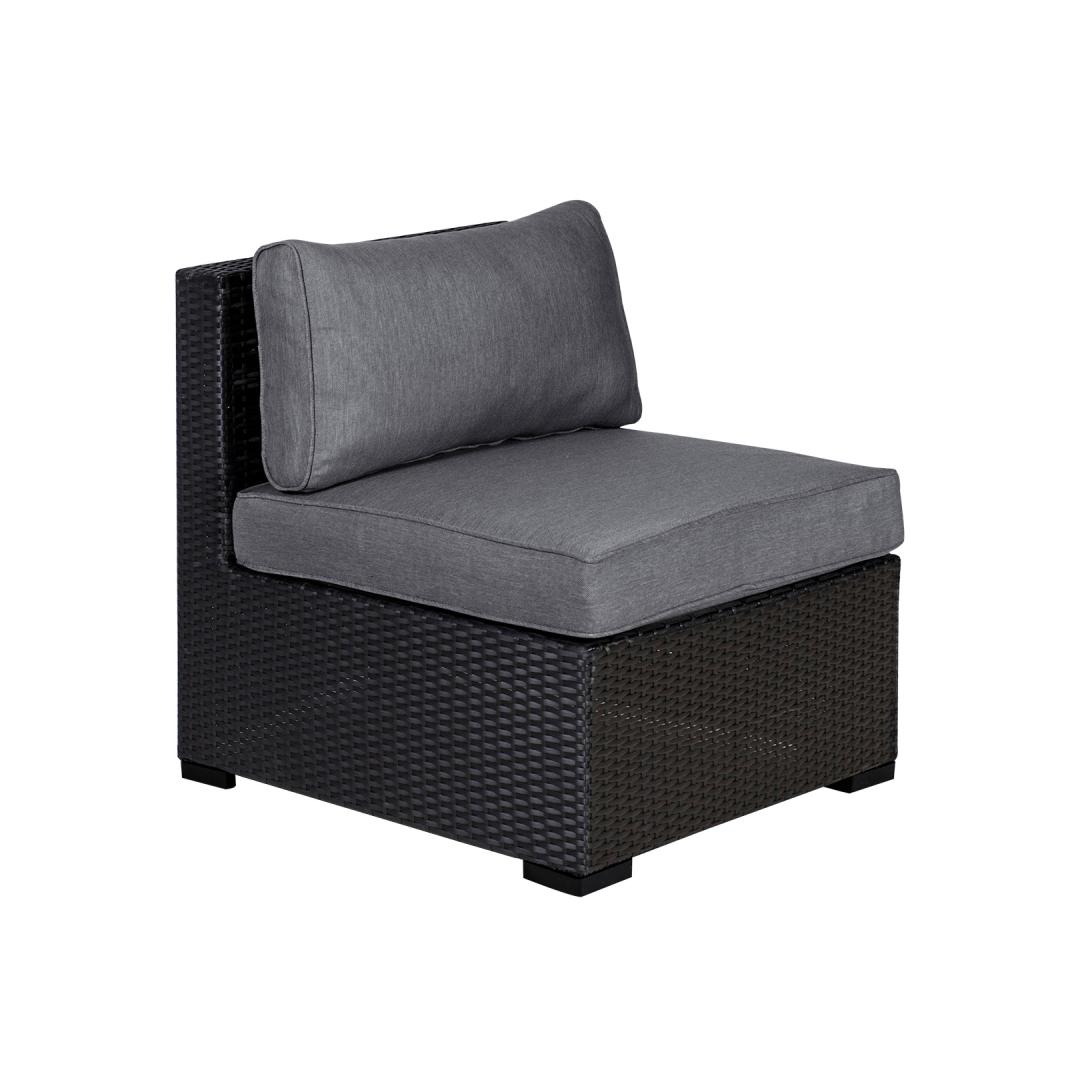 Sohvatyyny SEVILLA 67x76,5xH74,5cm, musta. Modulaarinen sohva on loistava tapa luoda oikean muotoinen ja kokoinen istuinryhmä, jota on helppo muuttaa ja järjestää uudelleen. Sohvan runko on valmistettu alumiinista ja päällystetty muovipunoksella. Tyynyt sisältyvät toimitukseen. Tyynynpäälliset on valmistettu harmaasta polyesterikankaasta. Tuote kestää hyvin vaihtelevia sääolosuhteita ja on helppo huoltaa. Ainoastaan tyynyt tarvitsevat suojaa säältä. Suosittelemme ulkokalusteiden käyttöiän pidentämiseksi ulkokuorien käyttöä. HUOLTO: Kesäkauden päätyttyä suosittelemme puutarhakalusteiden säilyttämistä sisätiloissa. Kesäkauden päätyttyä suosittelemme jättämään kalusteet puutarhaan talvikuukausiksi. Käytä säilytykseen kuivaa ja hyvin ilmastoitua tilaa.