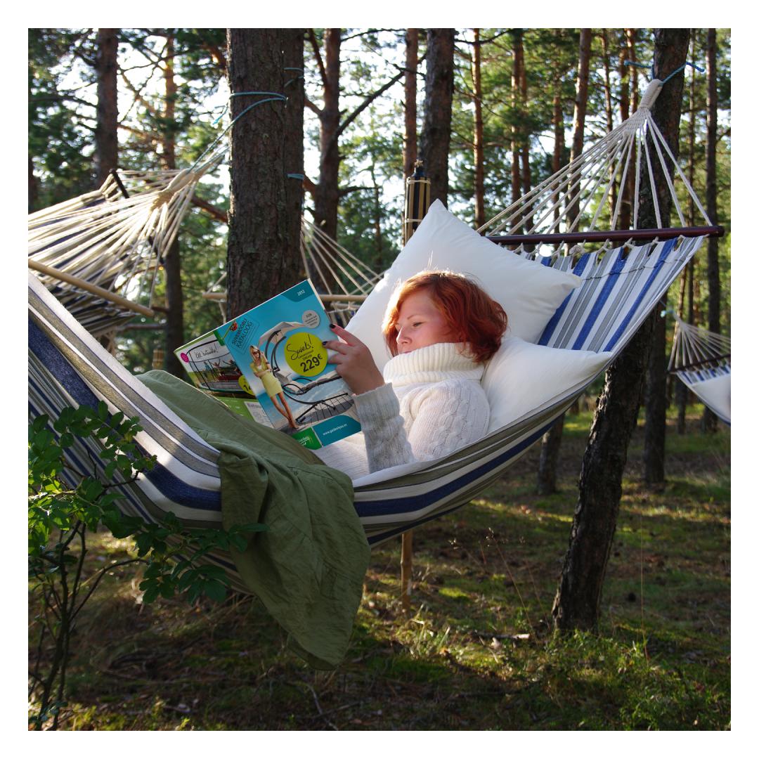 Riipus RIINA, sininen raita. Keinun makuuosa on valmistettu puuvillakankaasta. Kangasosan mitat ovat 85x190cm, puuosan 80x2,5cm. Suurin kantavuus 120kg. Keinu voidaan sijoittaa kahden puun tai tolpan väliin. Keinu on myös mahdollista ripustaa ylös kantotelineen avulla. Kiinnityspisteiden välisen etäisyyden on oltava vähintään 25-30cm pidempi kuin keinun kokonaispituus. HUOLTO: Tuotteen käyttöiän pidentämiseksi suojaa se säältä. Tuotteen käyttöiän pidentämiseksi suojaa tuote auringolta ja sateelta. Älä jätä keinua ulos pitkäksi aikaa ilman auringonvaloa tai altistumista liialliselle kosteudelle. Jos mahdollista, nosta riippukeinu käytön jälkeen ja säilytä kuivassa, hyvin ilmastoidussa huoneessa. Anna keinun kuivua kokonaan ennen varastointia. Keinu voidaan pestä käsin enintään 40-asteisessa vedessä. Käytä vain mietoja pesuaineita.