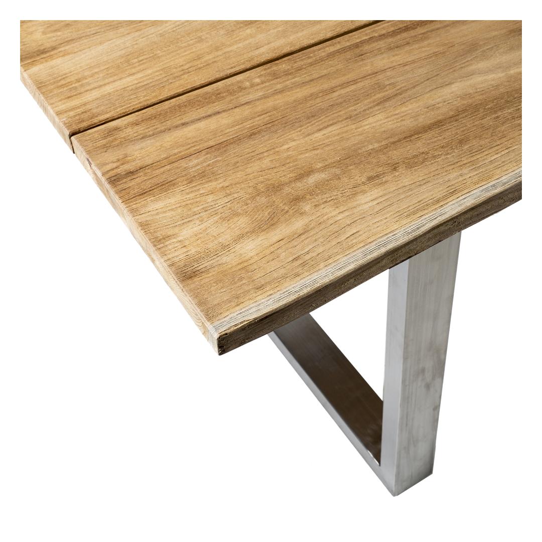 Pöytä NAUTICA 280x100xK76cm, teak. Kolmilevyinen pöytälevy, jossa on reunoittelemattomat reunat, A-luokan teakista valmistettu. Pinta, jossa on hienoksi hiottu maalaismainen viimeistely, on täysin luonnollinen luonnollisessa kauneudessaan, eikä sitä ole öljytty tai muuten kemiallisesti käsitelty. Pöydän jalat ja jalustakehikko on valmistettu ruostumattomasta teräksestä. A-luokan teak on täydellinen luonnonmateriaali ylellisiin ulkokalusteisiin. Puulla on tiheä ja tasainen rakenne, jossa on kaunis samettinen kiilto, ja se on väriltään kultaista vehnää ja metonya. Korkean luonnollisten öljyjen pitoisuutensa ansiosta teak kestää hyvin kosteutta ja puutuholaisia. Se kestää hyvin monenlaisia sääolosuhteita ja säilyttää erinomaisen ulkonäkönsä ja parhaat ominaisuutensa useita vuosia. Auringonvalo ja kosteus muuttavat pöydän pinnan ajan myötä kauniiksi hopeanharmaaksi. Tämä värimuutos on luonnollista eikä vaikuta puun laatuun. Eksklusiivinen lammikkopuupöytä soveltuu myös sisäkäyttöön. HUOLTO: puhdista säännöllisesti, suojaa kosteudelta ja UV-säteiltä. Puupinnat voidaan haluttaessa hioa kevyesti raikastamaan niitä. HUOLTO: kesäkauden päätyttyä suosittelemme puutarhakalusteiden säilyttämistä sisätiloissa. Kesäkauden päätyttyä on suositeltavaa jättää huonekalut puutarhaan jäähtymään ja kuivumaan ennen varastointia. Käytä säilytykseen kuivaa ja hyvin ilmastoitua tilaa.