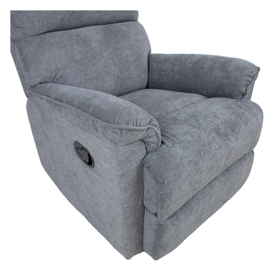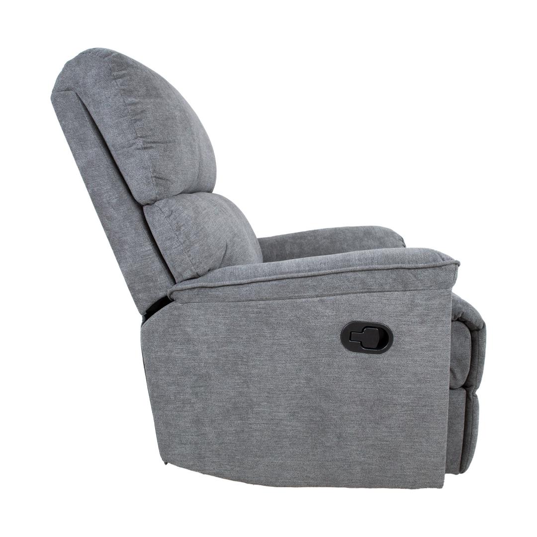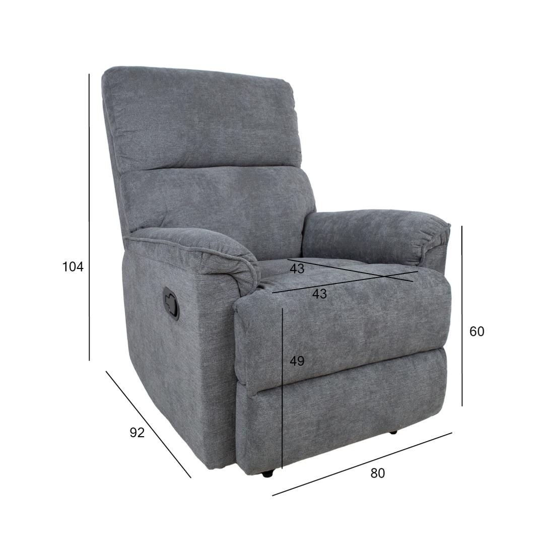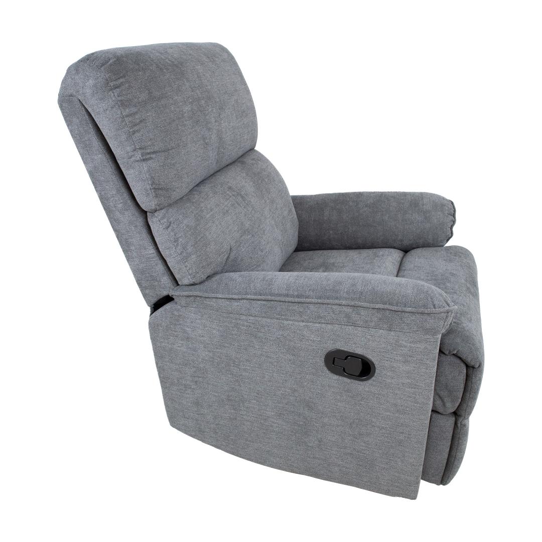 Nojatuoli GUSTAV manuaalinen lepotuoli 80x92xH104cm, harmaa. Nojautuva nojatuoli, jossa on manuaalinen mekanismi jalkatuen asennon muuttamiseksi. Selkänoja liikkuu pehmeästi, kun jalkatuki nostetaan ylös. Nosta jalkatukea vetämällä istuimen ulkopuolella olevaa vipua ylöspäin. Kun jalkatuki painetaan alas, se lukittuu automaattisesti alkuperäiseen asentoonsa. Päällysmateriaali: 100 % polyesterikangas, Martindale-arvo 10 000-15 000. Runko: puu, metalli. Verhoilu: polyuretaanivaahto 24kg/m³. Nojatuolin kokonaismitat: 80x92xK104cm. Istuimen leveys 43cm, istuimen syvyys 43cm, istuimen korkeus 49cm. Selkänojan korkeus 66cm. Käsinojan korkeus maasta 60cm.