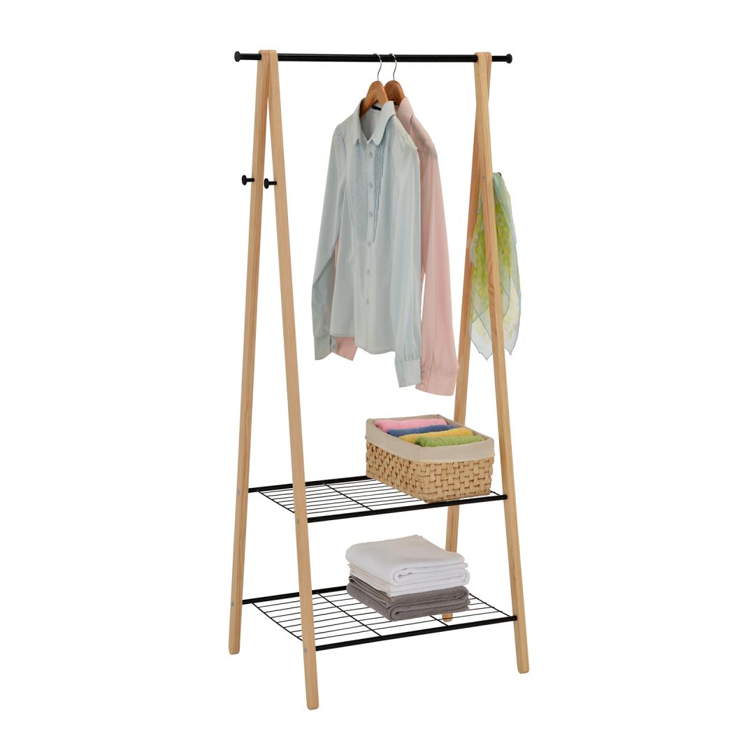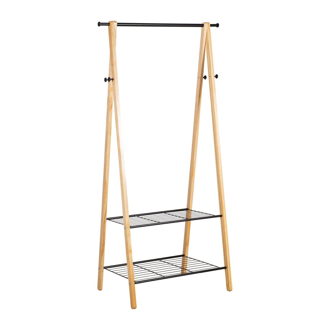 Pylväs FOREST 2 hyllyllä ja 4 tapilla 79x45xH155cm, materiaali: mänty/teräs, väri: luonnollinen/musta. Painorajoitus: tanko 10kg, hyllyt 8kg.