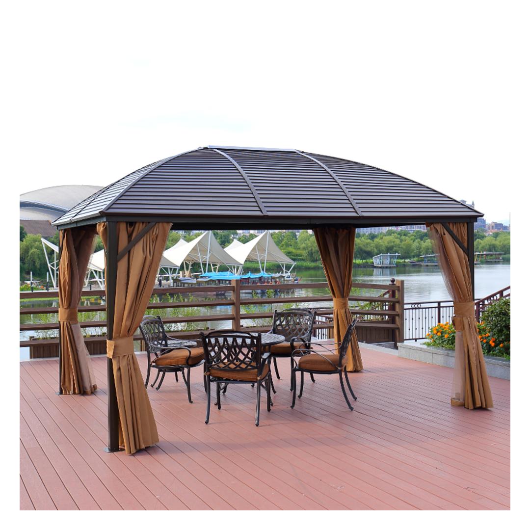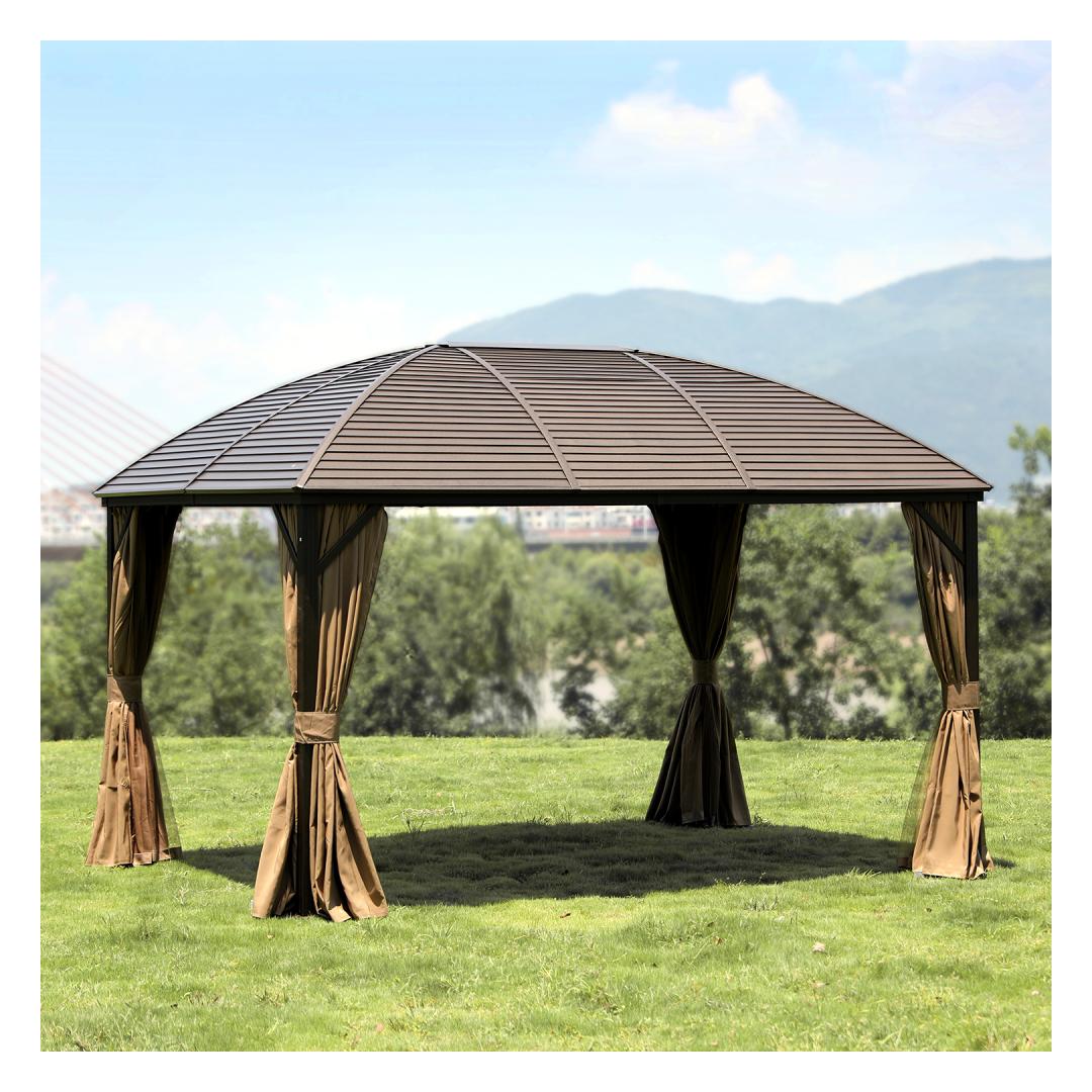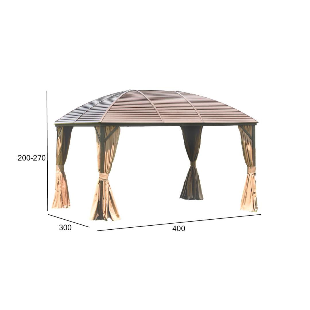 Katos SUNSET 3x4xH2/2,7m, ruskea/beige. Tyylikäs ja toimiva markiisi/katos tarjoaa suojaa ja varjoa kevyeltä sateelta ja paahtavalta auringolta, jolloin voit nauttia ulkoilmasta säästä ja vuorokaudenajasta riippumatta. Markiisin kaikilla sivuilla on beige polyesterikangasverhot (180g/m²) ja nailonista valmistetut hyttysverkot, jotka sulkeutuvat lukolla. Markiisin päärakenne on valmistettu alumiinista. Kaikki rungon osat on viimeistelty ruskealla pulverimaalilla. Sivutolppien mitat ovat 76x76mm, poikkipalkin mitat ovat 107x46mm, kattoristikot ovat 52x40x1mm, 44x31x1mm. Sinkitty metallikatto paksuus 4mm. VAROITUS: Äärimmäisissä sääolosuhteissa tai myrskyvaroituksissa katosta ei saa jättää ilman valvontaa. Äärimmäisissä sääolosuhteissa, esim. myrskyvaroitus tai katos ei ole vaarassa vaurioitua voimakkaan tuulen, sateen tai lumen vuoksi. HUOLTO: Markiisin käyttöiän pidentämiseksi suosittelemme, että se puretaan kesäkauden lopussa ja säilytetään viileässä, kuivassa ja hyvin ilmastoidussa tilassa. Jos markiisi jätetään pystyyn talveksi, on huolehdittava siitä, ettei katolle kerry liikaa lunta. Poista kertynyt lumi mahdollisimman pian. Poista hyttysverkot ja verhot kesäkauden lopussa. Puhdista ja kuivaa verhot ennen niiden varastointia.