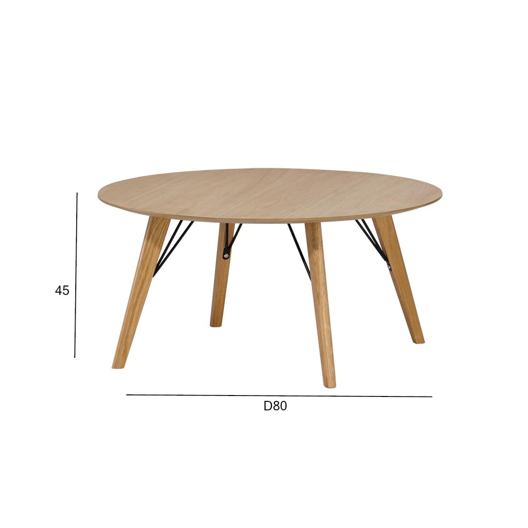 Sohvapöytä HELENA D80xH45cm. Pöytälevy: 18mm MDF, luonnon tammiviilu, lakattu. Pöydän jalat tammea, metallivahvikkeet.