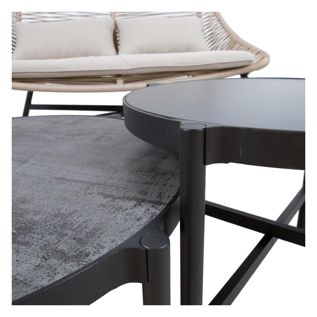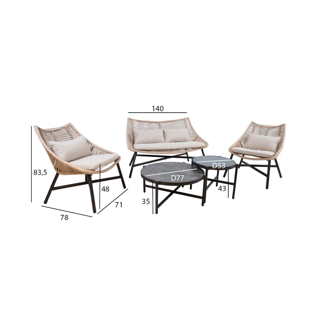 Puutarhakalustesarja HELSINKI sohva, 2 tuolia ja 2 pöytää. Kaikkien sarjan osien jalat ja rungot on valmistettu alumiinista ja viimeistelty tummanharmaalla pulverimaalilla. Sohvan ja tuolien istuimet on päällystetty beigellä muovipunoksella. Istuintyynyt sisältyvät toimitukseen. Tyynyt on valmistettu beigestä polyesterikankaasta. Suurempi pöytälevy: säänkestävä komposiittilautanen, jossa on kivikuori. Pienempi pöytälevy: tummanharmaa karkaistu lasi. Sohvan mitat 140x78xH83,5cm, tuolin 71x78xH83,5cm, pöytien D77xH35cm, D53xH43cm. Tuote on erittäin kestävä vaihtelevissa sääolosuhteissa ja helppo huoltaa. Ainoastaan tyynyt tarvitsevat suojaa säältä. Ulkokalusteiden käyttöiän pidentämiseksi suosittelemme ulkokalustesuojien käyttöä. HUOLTO: Kesäkauden päätyttyä suosittelemme puutarhakalusteiden säilyttämistä sisätiloissa. Kesäkauden päätyttyä suosittelemme jättämään huonekalut puutarhaan talvikuukausiksi. Käytä säilytykseen kuivaa ja hyvin ilmastoitua tilaa.
