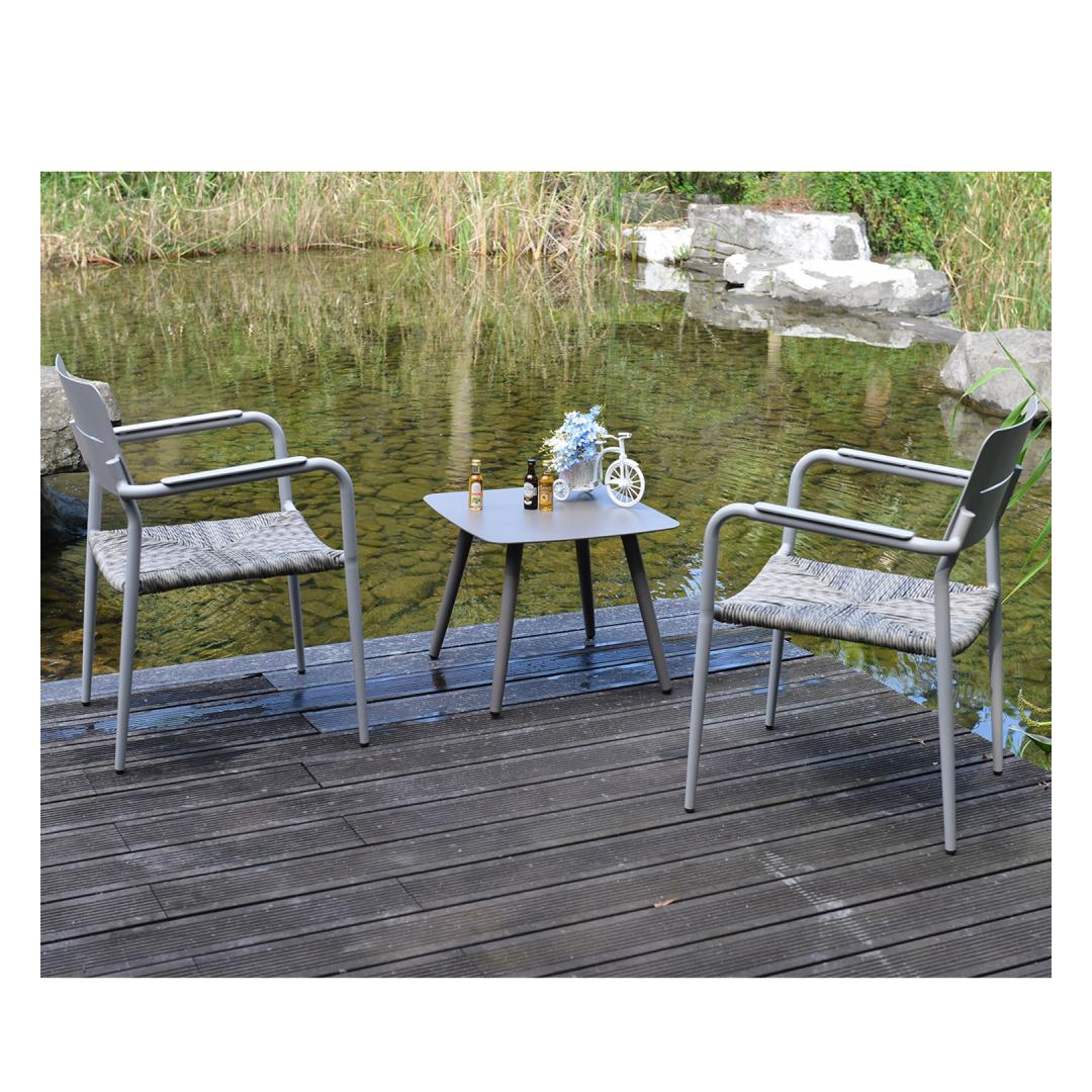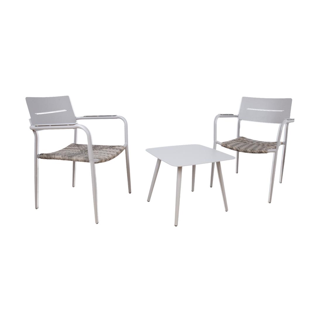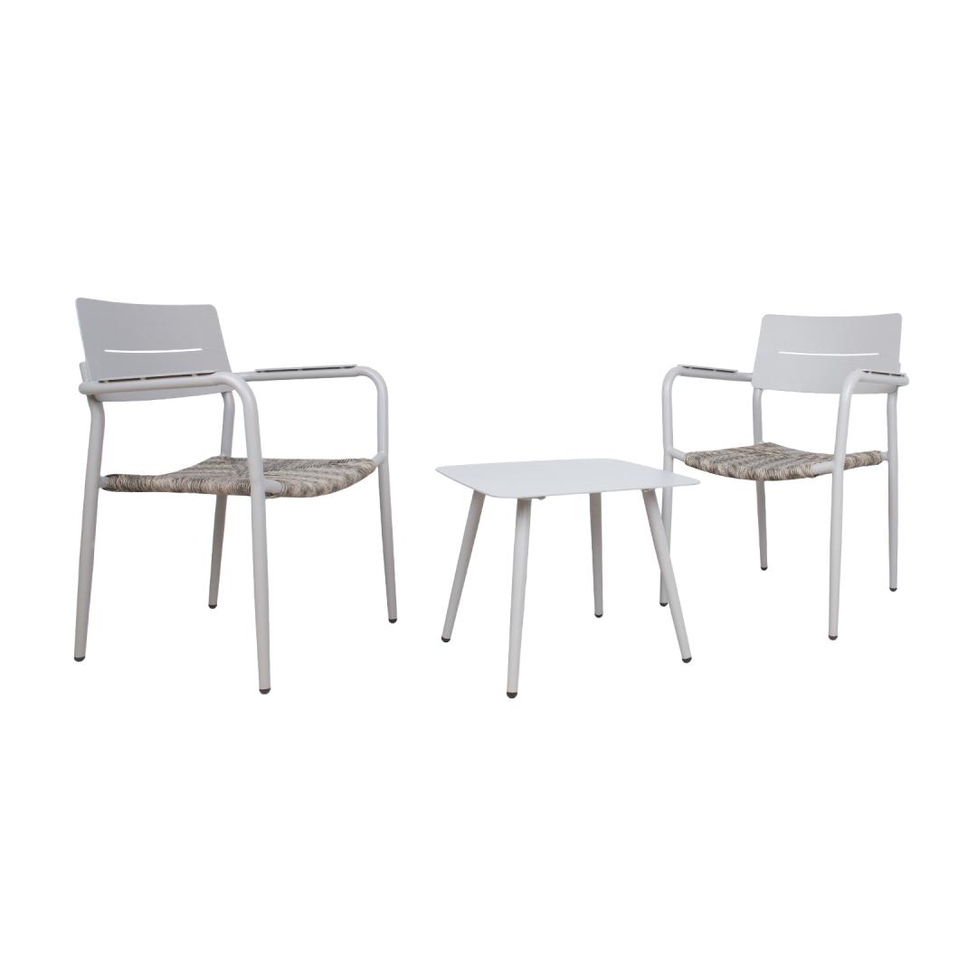 Parvekesetti COCORA, jossa pöytä ja 2 tuolia. Pöydän ja tuolien rungot, pöytälevy ja tuolien selkänojat on valmistettu alumiinista ja viimeistelty harmaa-beige pulverimaalilla. Tuolien istuinpohja on päällystetty narupunoksella. Pöydän mitat 50x50xK42cm, pöytälevyn paksuus 4mm. Tuolin mitat 57x58xH81cm, istuimen leveys 39cm, istuimen syvyys 49cm, istuimen korkeus 42cm, selkänojan korkeus 42cm, käsinojan korkeus maasta 65cm. Painoraja 110kg. Tuolit ovat pinottavia. Tuote on kestävä vaihtelevissa sääolosuhteissa ja erittäin helppohoitoinen. HUOLTO: Kesäkauden päätyttyä suosittelemme puutarhakalusteiden säilyttämistä sisätiloissa. Kesäkauden jälkeen puutarhakalusteet tulisi säilyttää kotona. Säilytä viileässä, kuivassa ja hyvin tuuletetussa tilassa.