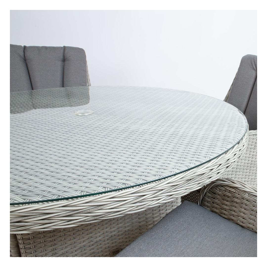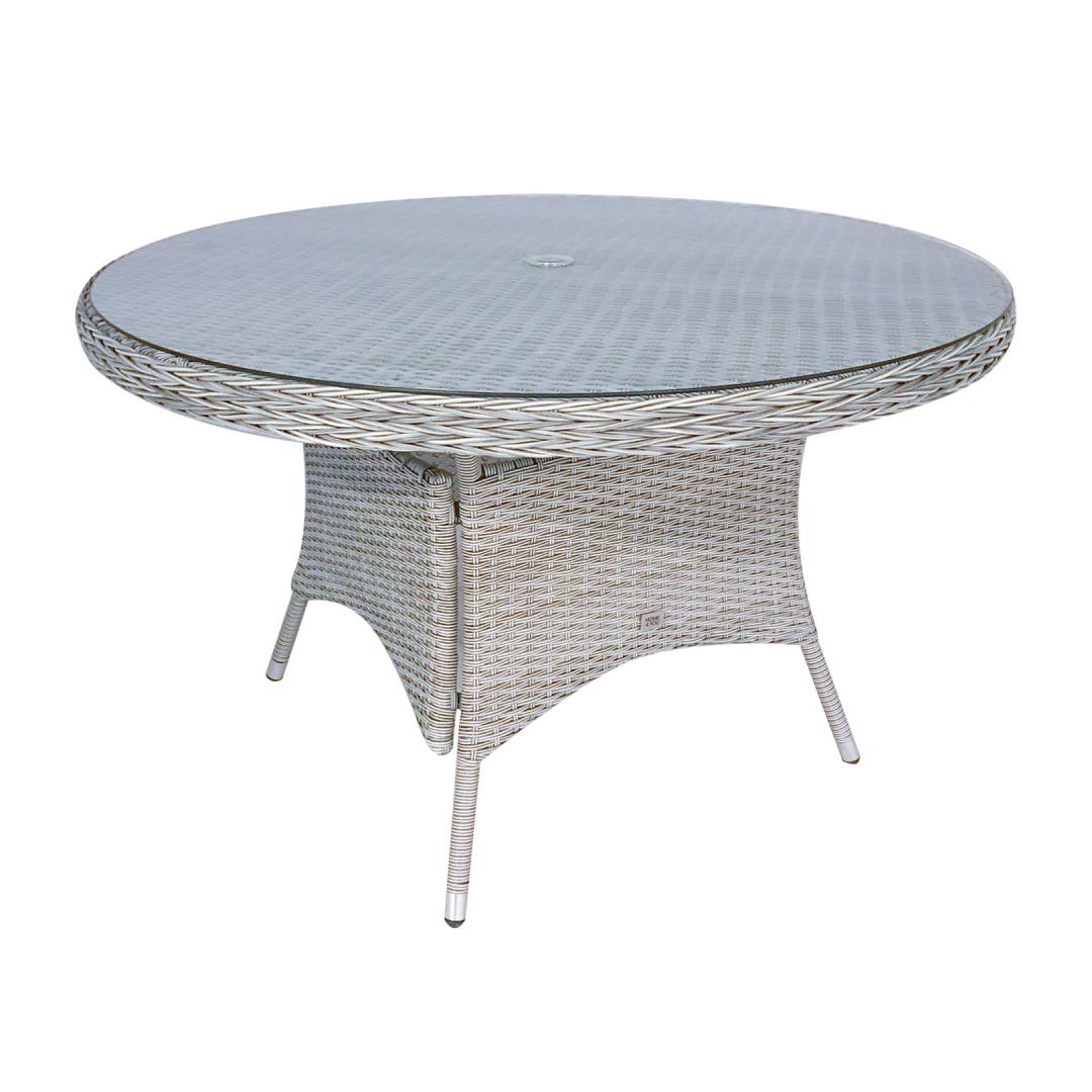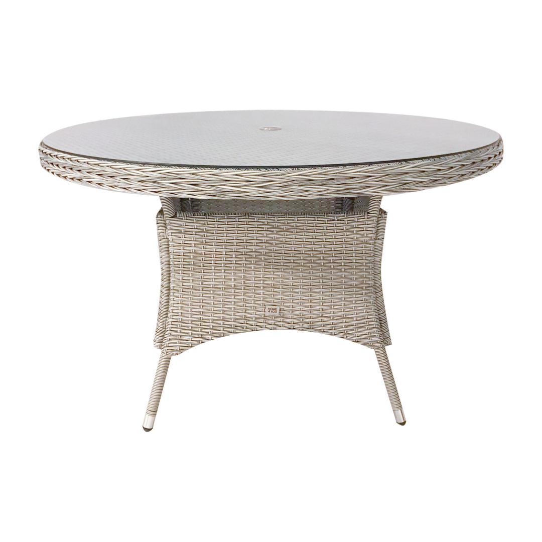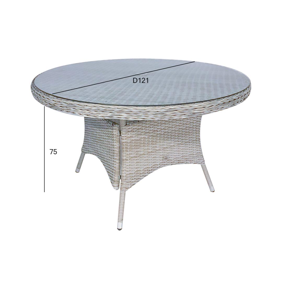Pöytä ASCOT D121xH75cm, harmaa. Pöydän runko on valmistettu alumiinista ja päällystetty harmaalla muovipunoksella. Pöytälevy: 8mm karkaistua läpinäkyvää lasia. Pöydän keskellä on reikä (D4cm) aurinkovarjoa varten. Tuote kestää vaihtelevia sääolosuhteita ja on erittäin helppohoitoinen. HUOLTO: kesäkauden päätyttyä suosittelemme puutarhakalusteiden säilyttämistä sisätiloissa. Kesäkuukausien jälkeen puutarhakalusteet tulisi säilyttää puutarhassa. Säilytä viileässä, kuivassa ja hyvin tuuletetussa tilassa.