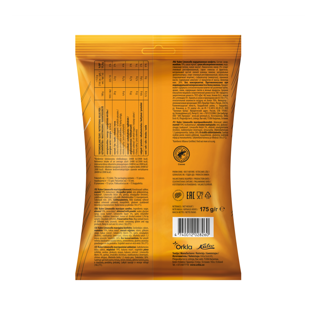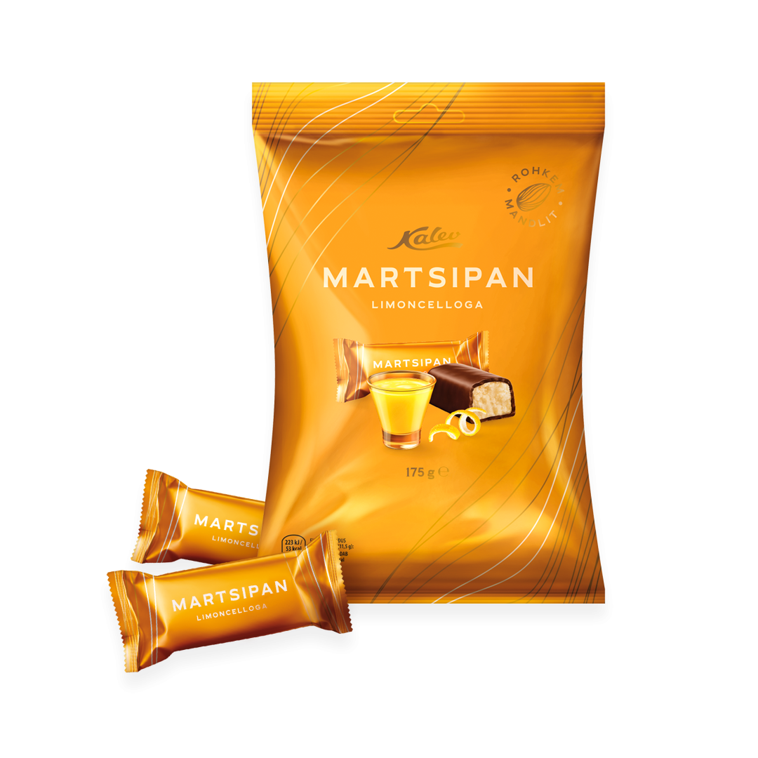 Kalev marsipaani nyt korkeammalla mantelipitoisuudella! Kalevin klassista marsipaania täydentää Limoncello, joka vie sinut makumatkalle suoraan Italiaan. Marsipaanilastut on päällystetty herkullisella tummalla suklaakuorrutteella.