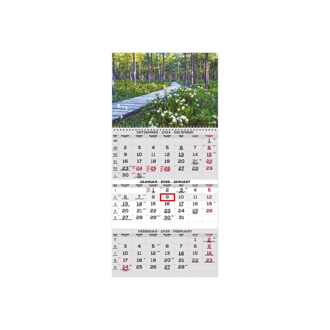 Koko: 297×630 mm Kieli: Kieli: EE, EN yleiset vapaapäivät, kansalliset ja kansalliset kalenteripäivät, liputuspäivät, 38 maan yleiset vapaapäivät lyhenteineen, auringonnousu- ja -laskuajat (Tallinna), kuun vaiheet, horoskooppimerkit, vuodenaikojen alkamisajat kellonaikoineen, edeltävät ja seuraavat vuodenaikojen alkamisajat