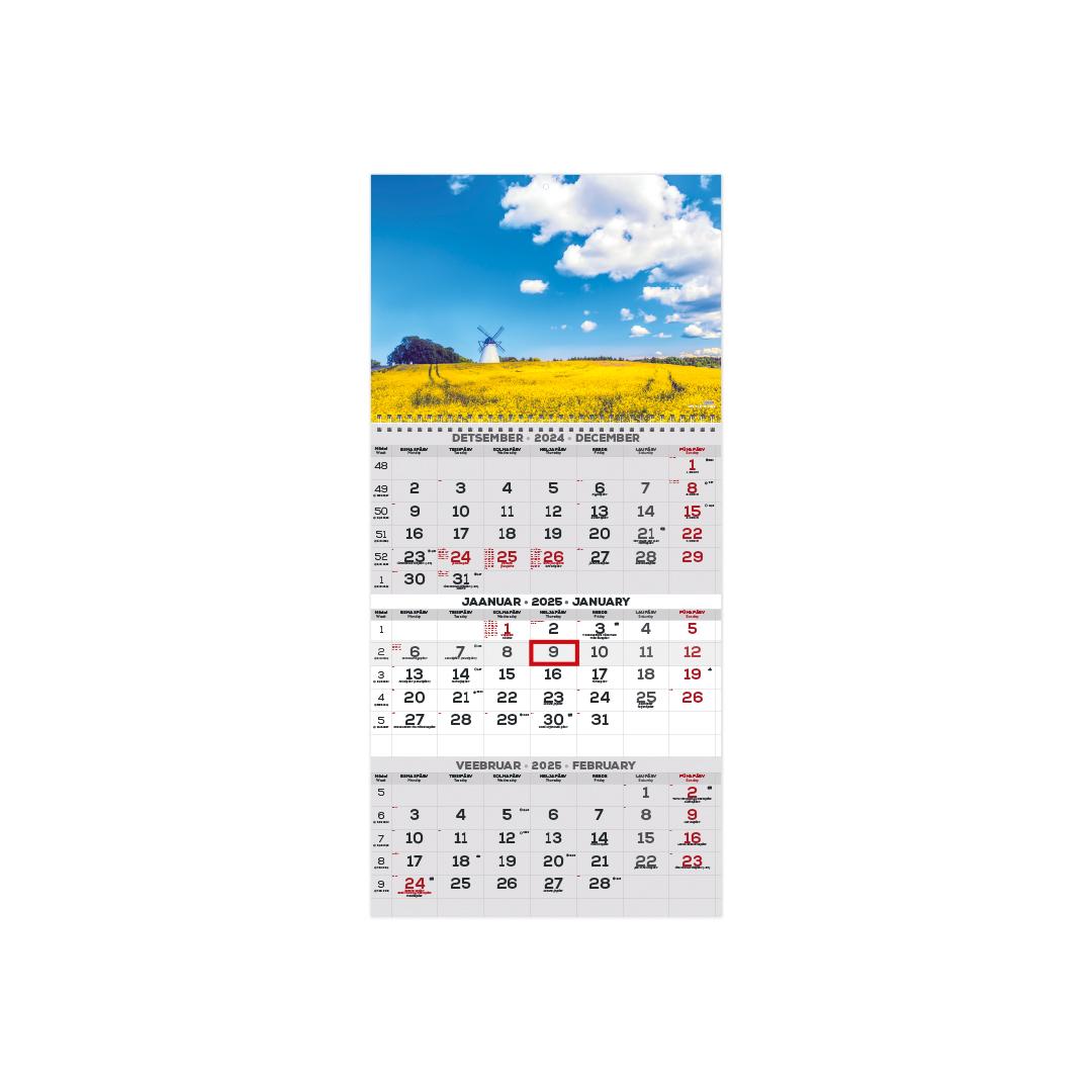 Koko: 297×630 mm Kieli: Kieli: EE, EN yleiset vapaapäivät, kansalliset ja kansalliset kalenteripäivät, liputuspäivät, 38 maan yleiset vapaapäivät lyhenteineen, auringonnousu- ja -laskuajat (Tallinna), kuun vaiheet, horoskooppimerkit, vuodenaikojen alkamisajat kellonaikoineen, edeltävät ja seuraavat vuodenaikojen alkamisajat