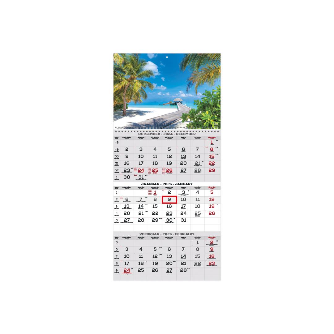 Koko: 297×630 mm Kieli: Kieli: EE, EN yleiset vapaapäivät, kansalliset ja kansalliset kalenteripäivät, liputuspäivät, 38 maan yleiset vapaapäivät lyhenteineen, auringonnousu- ja -laskuajat (Tallinna), kuun vaiheet, horoskooppimerkit, vuodenaikojen alkamisajat kellonaikoineen, edeltävät ja seuraavat vuodenaikojen alkamisajat