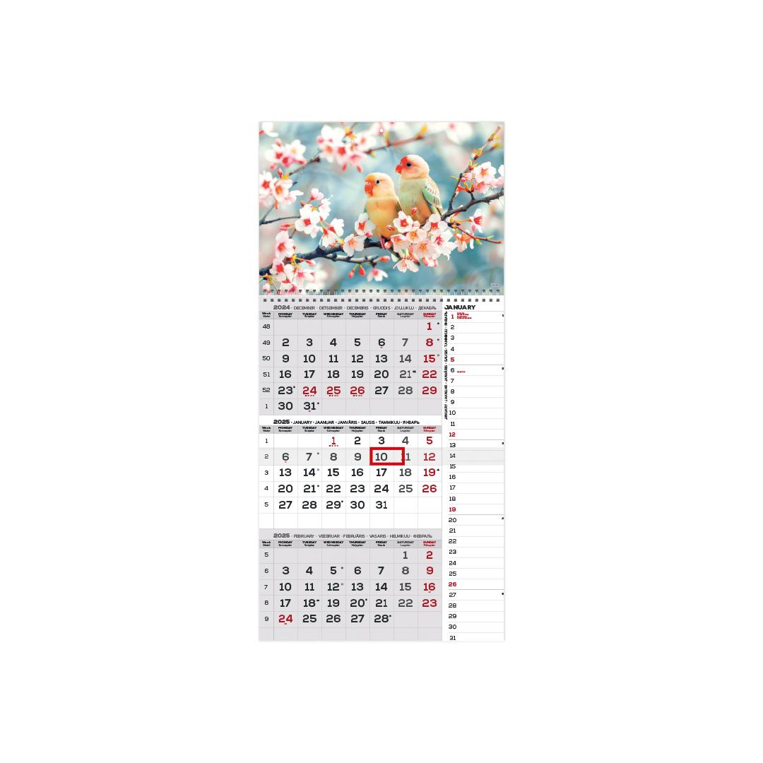 Koko: 297 x 630 mm Kierresidonta Saranoitu kansi Sisällysluettelo 12 sivua Päivämäärämerkintä Sisältö tummanharmaa / punainen Kieli: viro, englanti, latvia, latvian kieli, latvian kieli, liettuan kieli, suomi, venäjä Kalenteri sisältää: kansalliset juhlapäivät, 4 kansallista juhlapäivää lyhenteillä (EST, LAT, LIT, FIN), kuukauden vaiheet, horoskooppimerkit, edellinen ja seuraava kuukausi, viikon numero.
