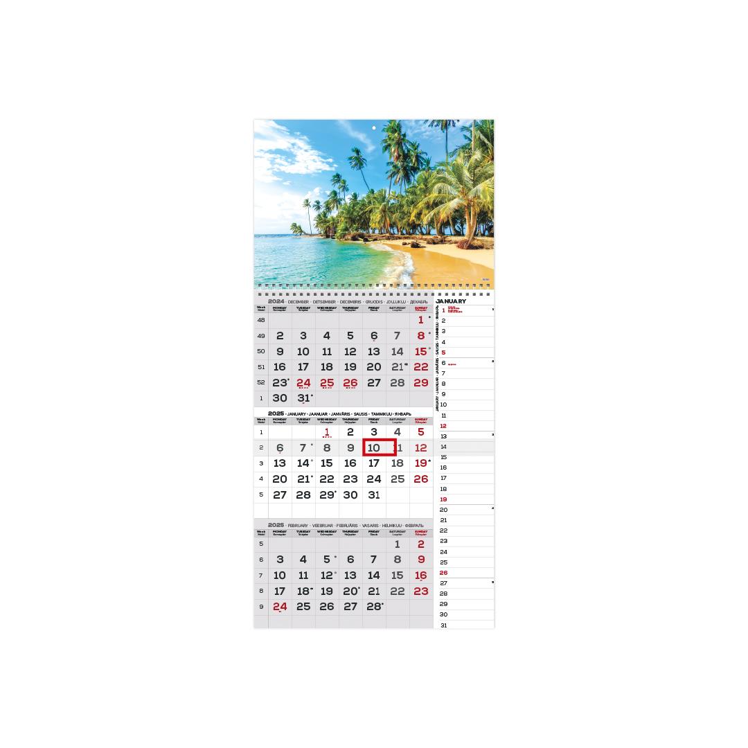 Koko: 297 x 630 mm Kierresidonta Saranoitu kansi Sisällysluettelo 12 sivua Päivämäärämerkintä Sisältö tummanharmaa / punainen Kieli: viro, englanti, latvia, latvian kieli, latvian kieli, liettuan kieli, suomi, venäjä Kalenteri sisältää: kansalliset juhlapäivät, 4 kansallista juhlapäivää lyhenteillä (EST, LAT, LIT, FIN), kuukauden vaiheet, horoskooppimerkit, edellinen ja seuraava kuukausi, viikon numero.