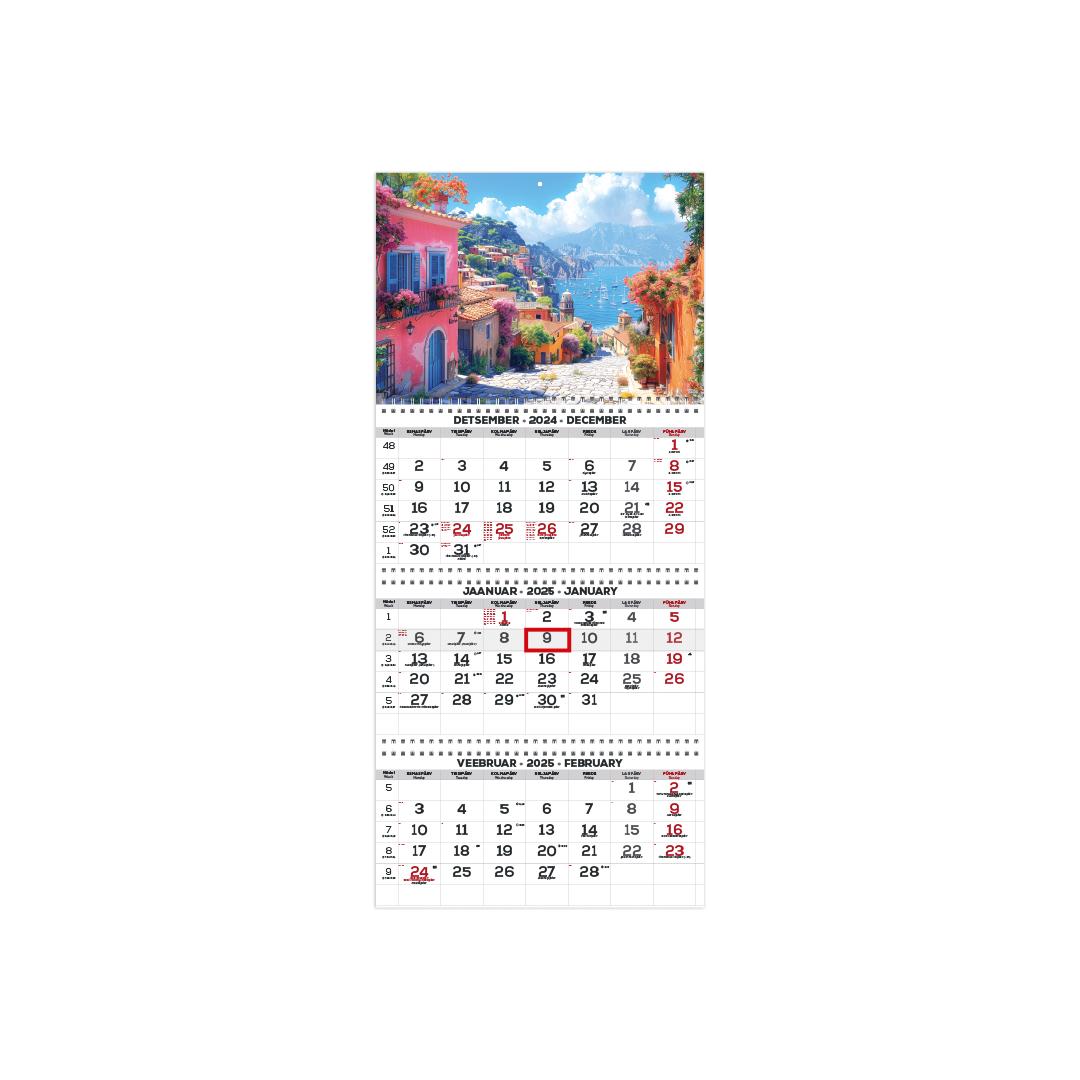 Koko: 297 x 650 mm Kolmiosainen kierresidonta Ripustusreikä Kapasiteetti 3 x 12 sivua Päivämäärämerkintä Sisältö tummanharmaa / punainen Kieli: englanti ja viro Kalenteri sisältää: Juhlapyhät, kansalliset ja kansalliset kalenterimerkinnät, liputuspäivät, 37 maan juhlapyhät lyhenteineen, kesä- ja talviaikaan siirtyminen, auringonnousu- ja -laskuajat (Tallinna), kuukauden vaiheet kellonaikoineen, horoskooppimerkit, vuodenaikojen alkamisajat kellonaikoineen, edeltävä ja seuraava kuukausi, viikkonumero.