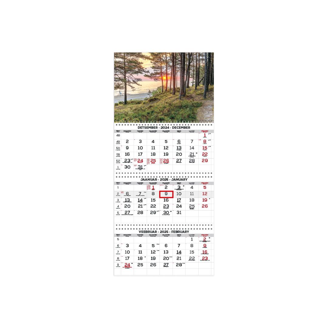Koko: 297 x 650 mm Kolmiosainen kierresidonta Ripustusreikä Kapasiteetti 3 x 12 sivua Päivämäärämerkintä Sisältö tummanharmaa / punainen Kieli: englanti ja viro Kalenteri sisältää: Juhlapyhät, kansalliset ja kansalliset kalenterimerkinnät, liputuspäivät, 37 maan juhlapyhät lyhenteineen, kesä- ja talviaikaan siirtyminen, auringonnousu- ja -laskuajat (Tallinna), kuukauden vaiheet kellonaikoineen, horoskooppimerkit, vuodenaikojen alkamisajat kellonaikoineen, edeltävä ja seuraava kuukausi, viikkonumero.