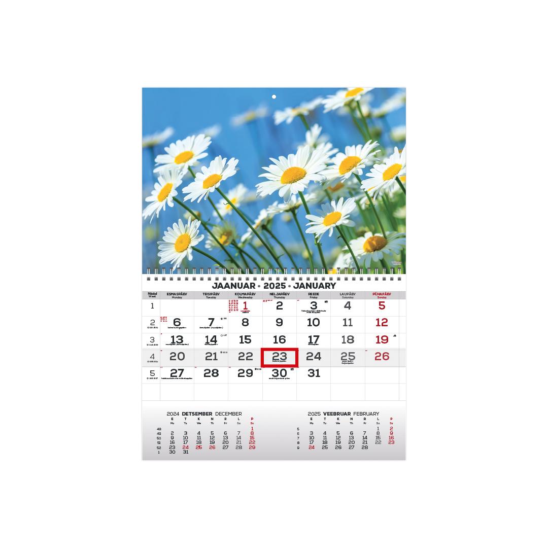 Koko: 297 x 420 mm Kierresidonta Saranoitu kansi Tilavuus 12 sivua Päivämäärämerkintä Sisältö tummanharmaa / punainen Kieli: englanti ja viro Kalenteri sisältää: Kalenteri sisältää: yleiset juhlapäivät, kansalliset ja kansalliset kalenteritarkkailut, liputuspäivät, 37 maan yleiset juhlapäivät lyhenteineen, kesä- ja talviaikaan siirtyminen, auringonnousu- ja -laskuajat (Tallinnassa), kuukauden vaiheet kellonaikoineen, horoskooppimerkit, vuodenaikojen alkamisajat kellonaikoineen, edeltävä ja seuraava kuukausi, viikkonumero. kalenteri.