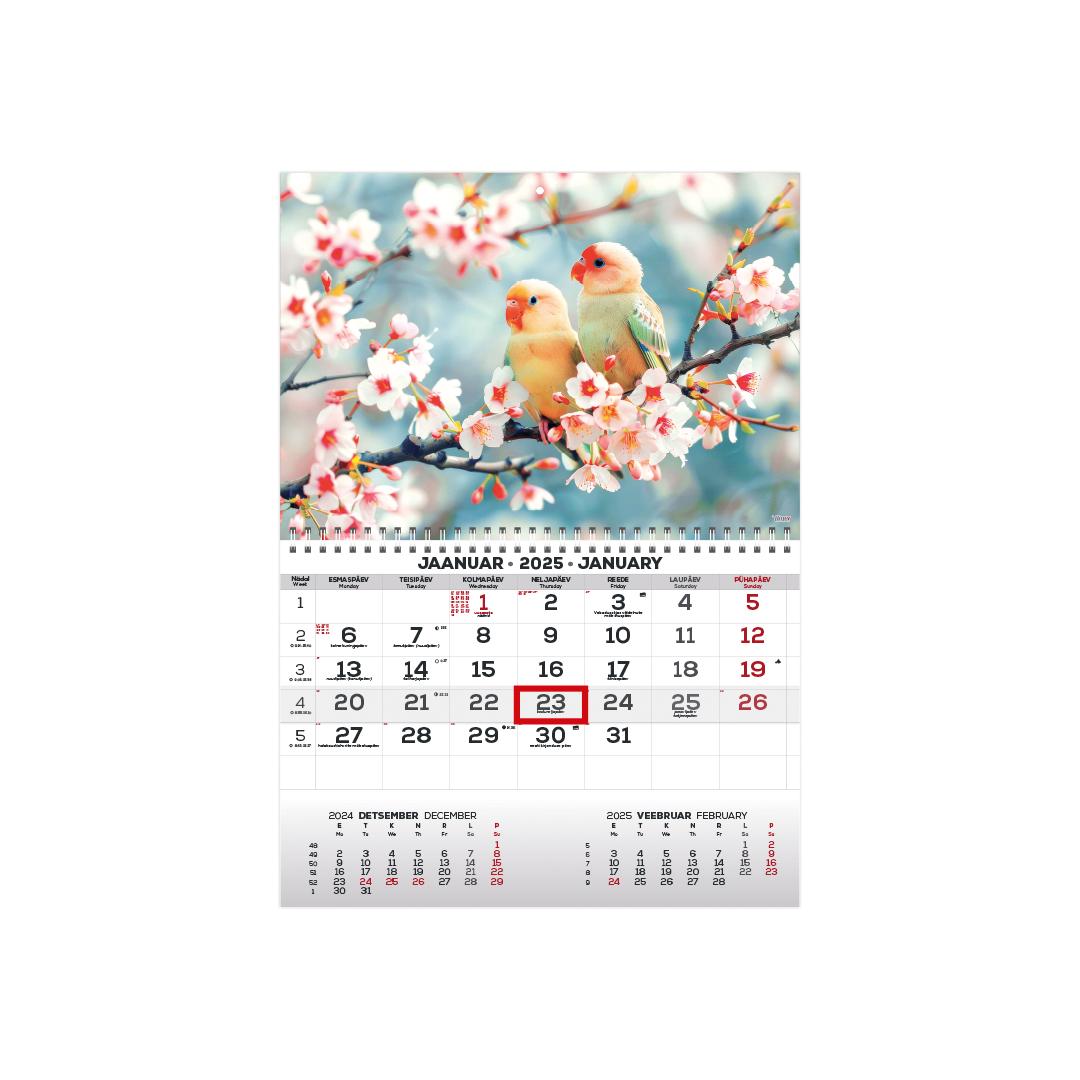 Koko: 297 x 420 mm Kierresidonta Saranoitu kansi Tilavuus 12 sivua Päivämäärämerkintä Sisältö tummanharmaa / punainen Kieli: englanti ja viro Kalenteri sisältää: Kalenteri sisältää: yleiset juhlapäivät, kansalliset ja kansalliset kalenteritarkkailut, liputuspäivät, 37 maan yleiset juhlapäivät lyhenteineen, kesä- ja talviaikaan siirtyminen, auringonnousu- ja -laskuajat (Tallinnassa), kuukauden vaiheet kellonaikoineen, horoskooppimerkit, vuodenaikojen alkamisajat kellonaikoineen, edeltävä ja seuraava kuukausi, viikkonumero. kalenteri.