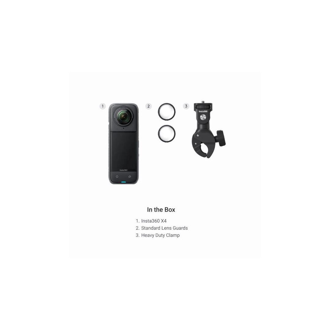 Moottoripyörän ohjaustankopaketti sisältää 1x Insta360 X4, 1x vakio-objektiivin suojukset ja 1x raskaan kiinnikkeen. Insta360 X4 -moottoripyöräpaketti