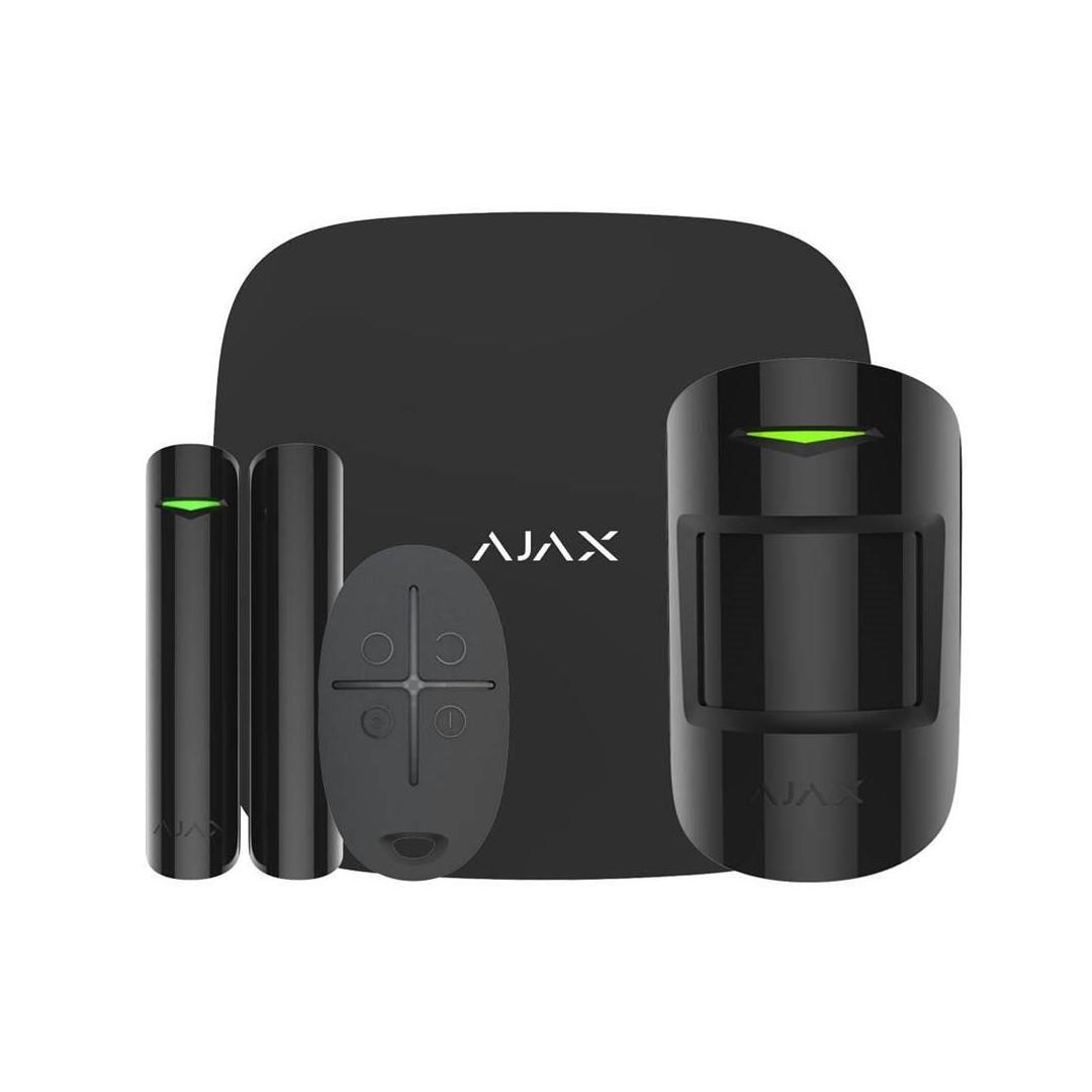 Väri Musta Ajax-turvajärjestelmän aloituspaketti. Pakkaus koostuu keskuksesta, liiketunnistimesta, avautumisilmaisimesta ja paniikkipainikkeella varustetusta avaimenperästä.