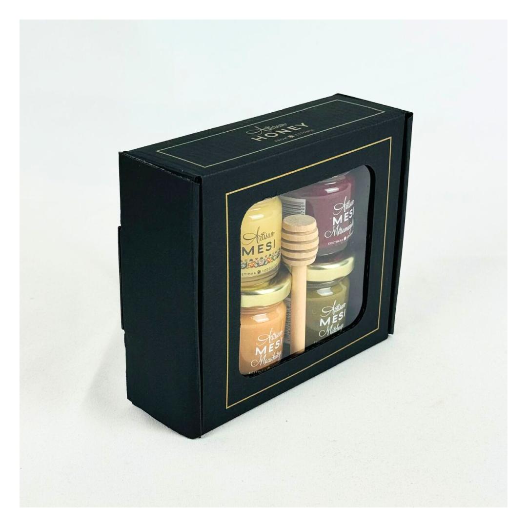 Artisan Honey -lahjasetti, 4 x 50 g hunajapurkkia ja puinen hunajasekoitin