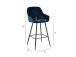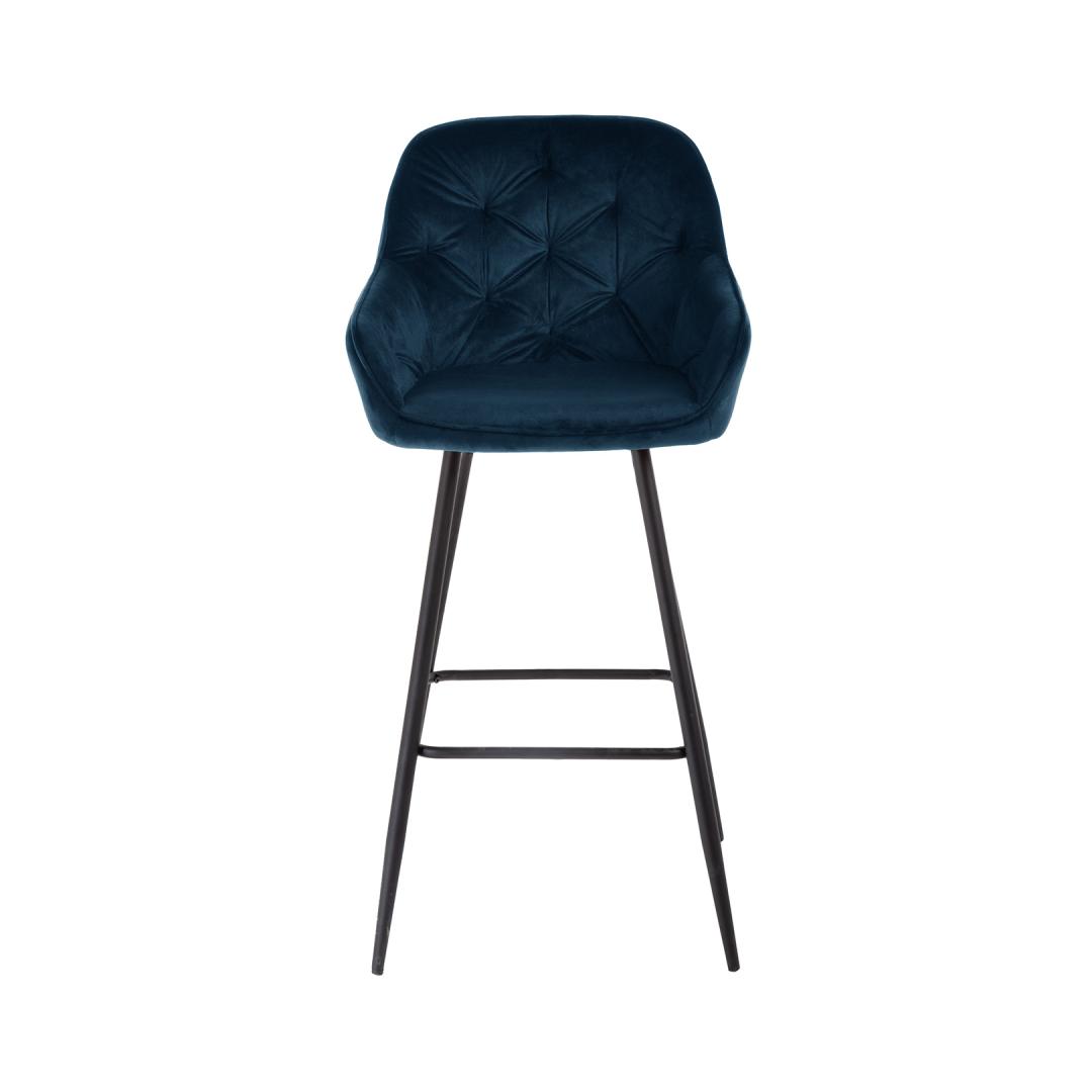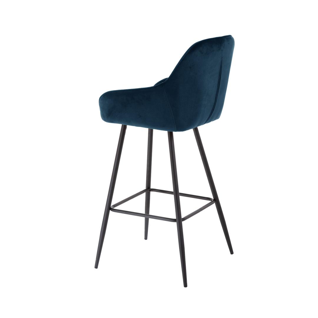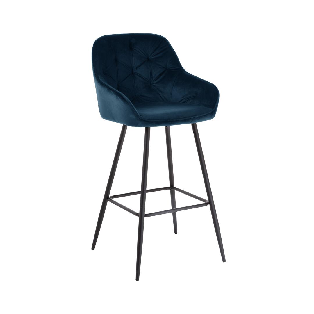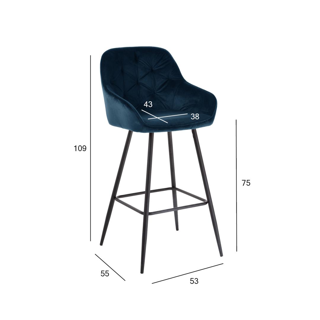Bar stool BRITA blue velvet. The comfortably shaped bent plywood seat is lightly padded and covered with velvet fabric. Cover material: 100% polyester, 260g/m². Martindale 25,000. The legs and base frame of the chair are made of metal and finished with black powder coating. The overall dimensions of the chair are 53x55xH109cm, seat width 38cm, seat depth 43cm, seat height 75cm. Backrest height 37cm, footrest height 29cm. Weight limit 120 kg.