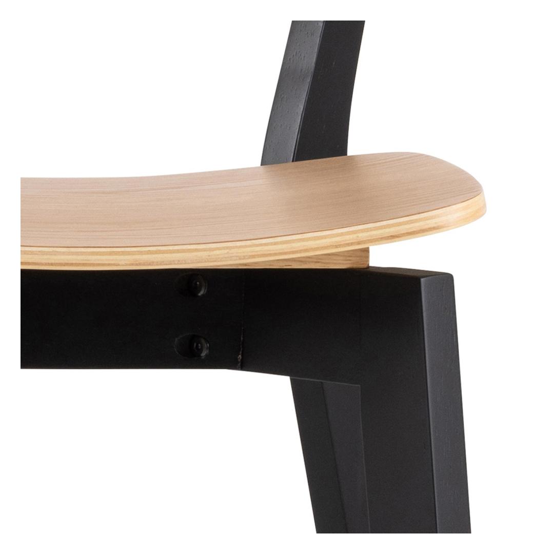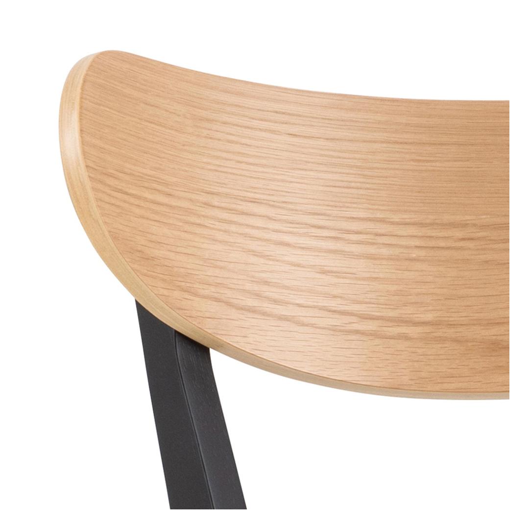 Ilmeikäs, ristiriitaisen näköinen baarimikko. Pyöreä istuin ja kaareva selkänoja. Tammesta lakattu istuin ja selkänoja. Mustaksi lakattu puujalusta, jossa jalkatuki. Helposti huollettava pinta. Mitat 45x49xK105cm.
